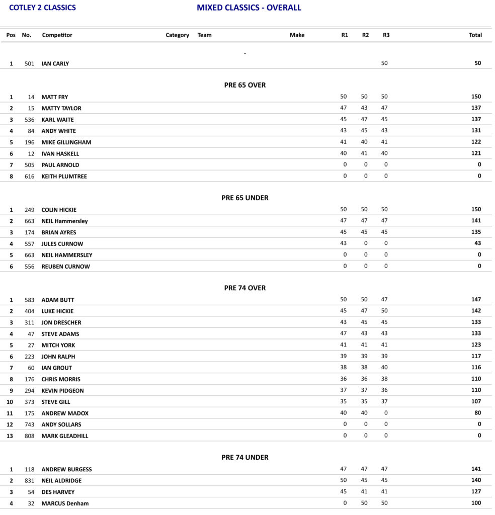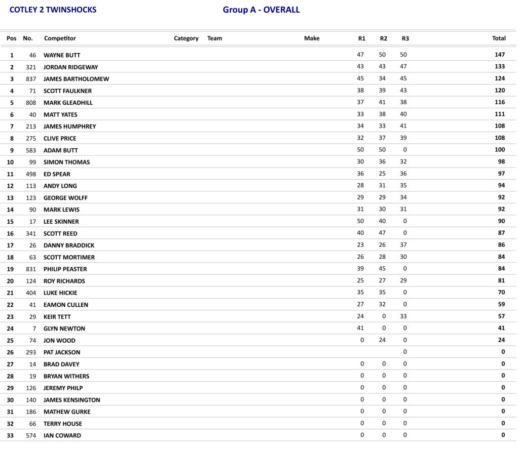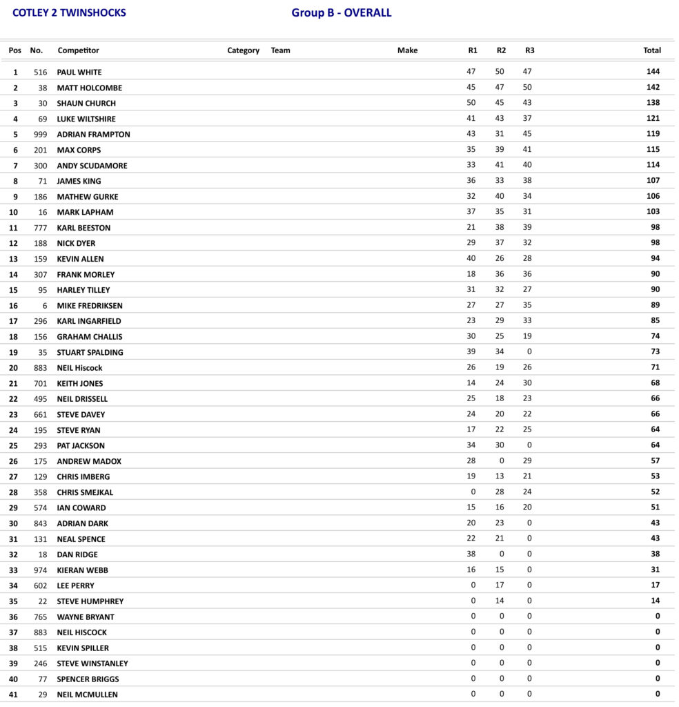 In the Twinshock D class, it proved a good day for Ashton Butt who was back riding competitively after a lapse of seven years as he won the opening two races only to be beaten into second in the last race by Colin Ayles but with two wins and a second, it was Butt who took his first-ever overall win ahead of Ayles with Robert Coleman taking third overall.