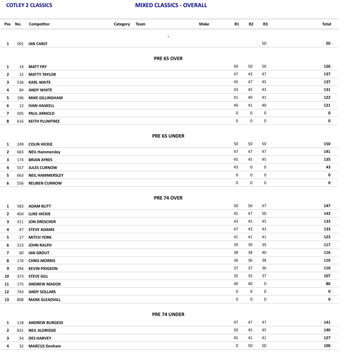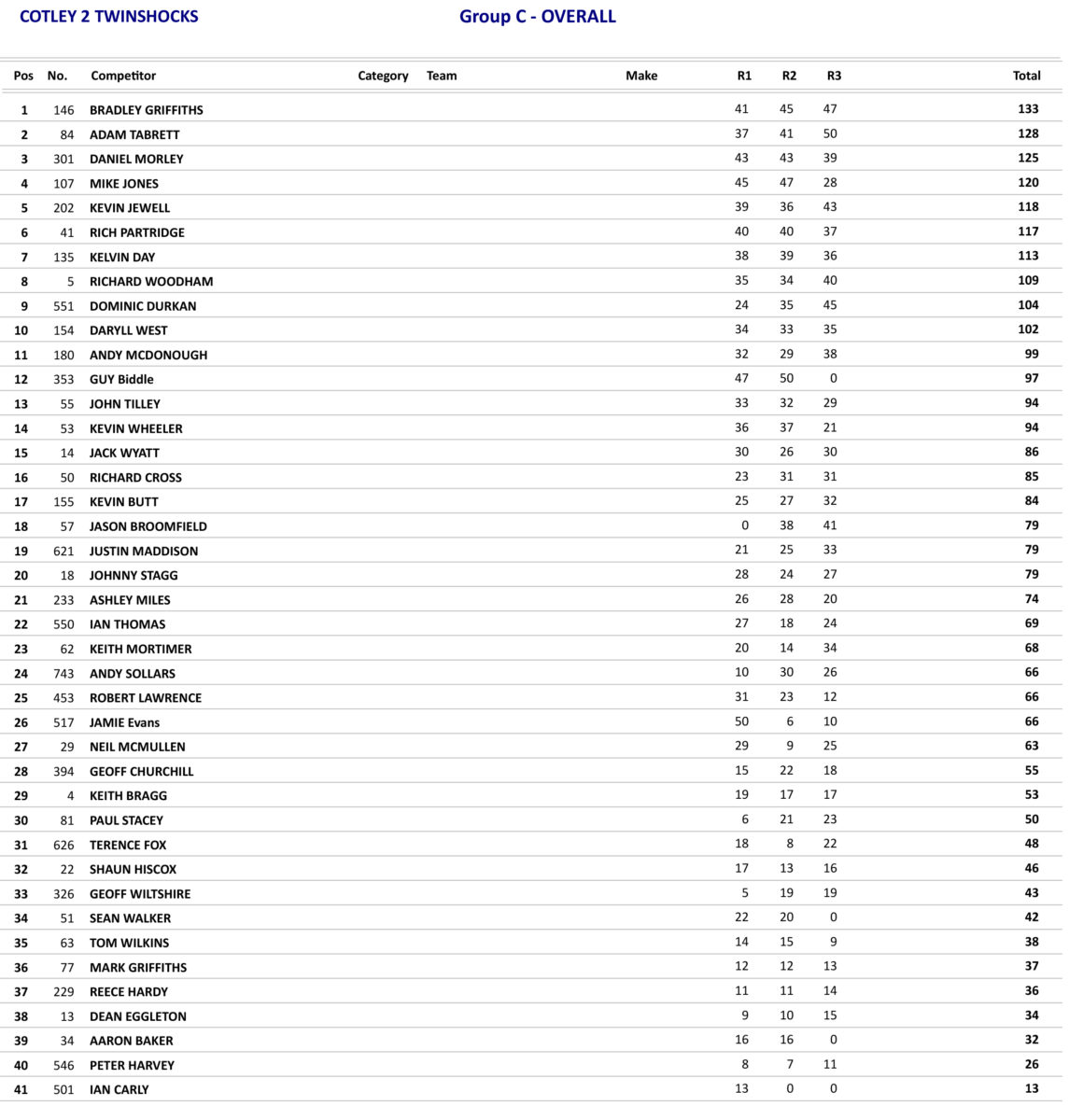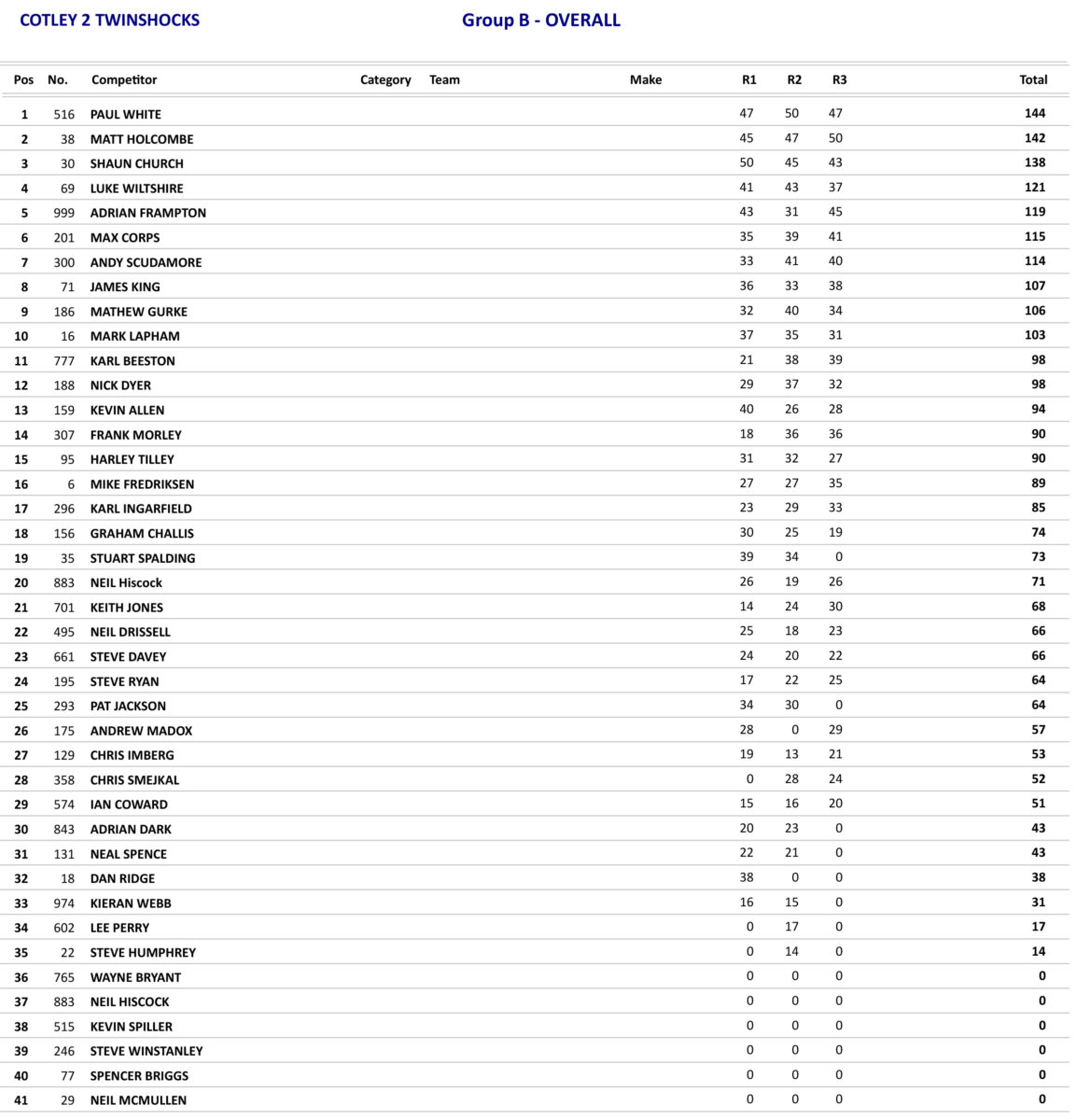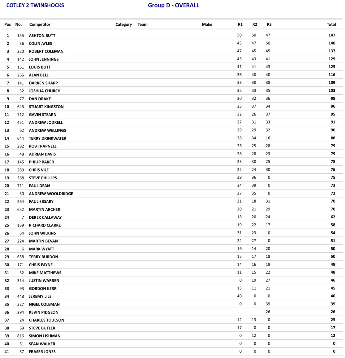 In the Twinshock D class, it proved a good day for Ashton Butt who was back riding competitively after a lapse of seven years as he won the opening two races only to be beaten into second in the last race by Colin Ayles but with two wins and a second, it was Butt who took his first-ever overall win ahead of Ayles with Robert Coleman taking third overall.