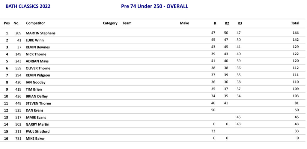 In the Pre 74 Class there was some quick racers and one of them was Greg Speed on the 500 BSA Cheney who just piped the 500 CCM of Aaron Graves in to the first corner. Speed was trying his hardest to get away at the front but all the time he was gradually being pressured and joining in with the pressure was Kristian Marshall on his 380 CZ who was soon in second and up in to third was soon to be Allen Waring also on a 380 CZ. Marshall and Waring got pass Speed and were having a real tussle at the front with virtually nothing between them as they went into the penultimate lap, but Waring was to go missing as they returned in to sight as his chain had come off and this let Marshall go on to take the win. Waring was determined in the second race and took the win holding off Adam Butt on the 350 Hickie BSA. Marshall came home in 4th behind Graves which was to give him the overall by one point from Butt with Graves third overall.