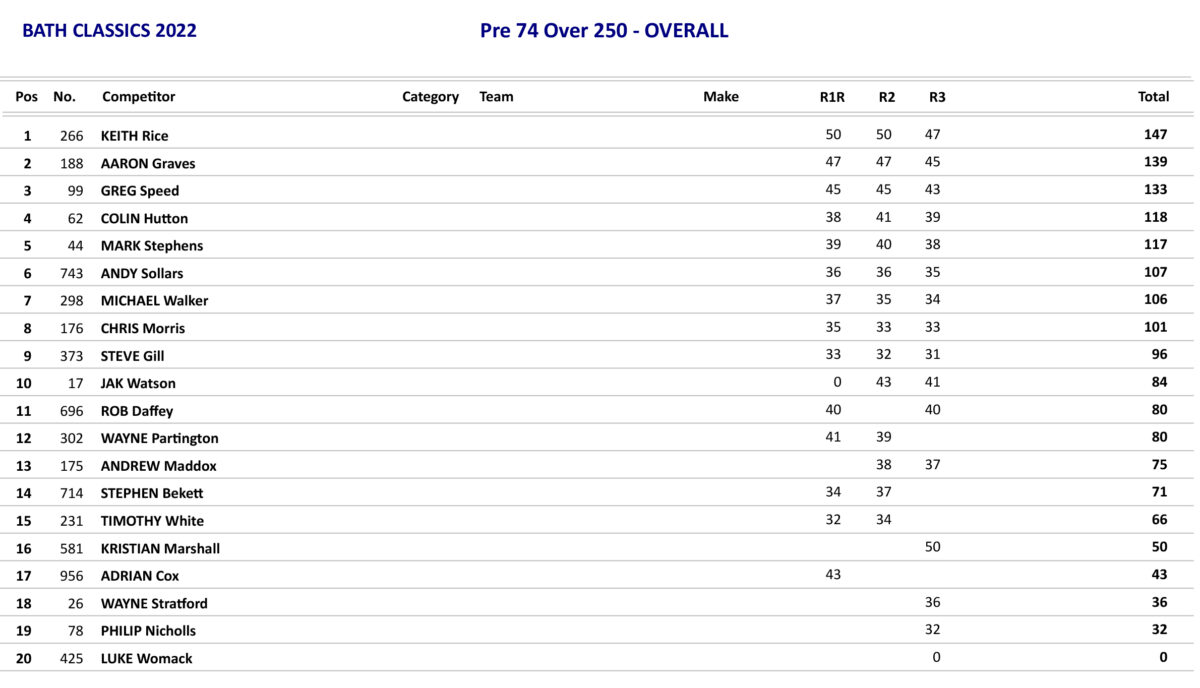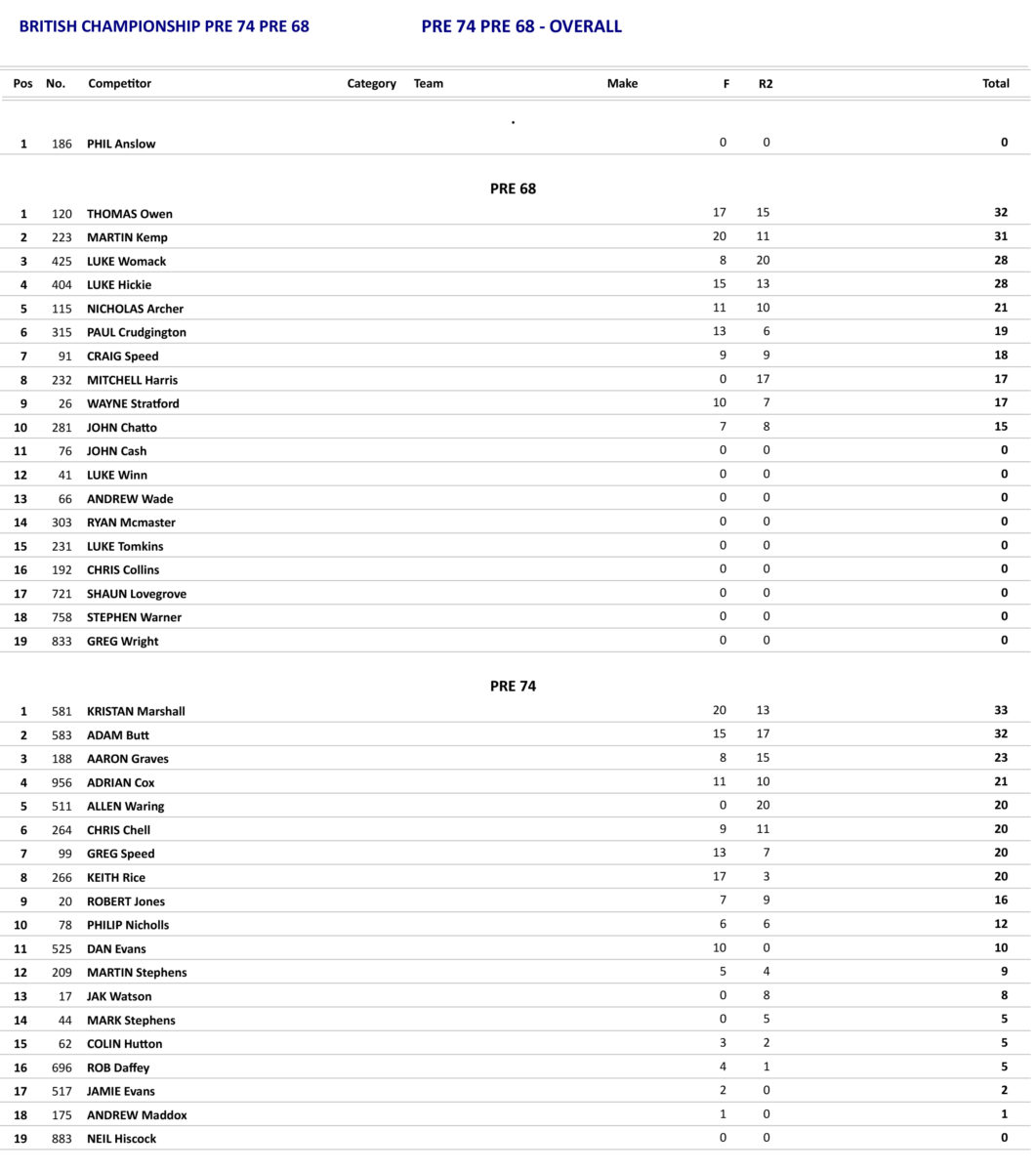 In the Pre 74 Class there was some quick racers and one of them was Greg Speed on the 500 BSA Cheney who just piped the 500 CCM of Aaron Graves in to the first corner. Speed was trying his hardest to get away at the front but all the time he was gradually being pressured and joining in with the pressure was Kristian Marshall on his 380 CZ who was soon in second and up in to third was soon to be Allen Waring also on a 380 CZ. Marshall and Waring got pass Speed and were having a real tussle at the front with virtually nothing between them as they went into the penultimate lap, but Waring was to go missing as they returned in to sight as his chain had come off and this let Marshall go on to take the win. Waring was determined in the second race and took the win holding off Adam Butt on the 350 Hickie BSA. Marshall came home in 4th behind Graves which was to give him the overall by one point from Butt with Graves third overall.