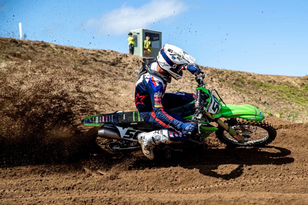 Business as usual for Tony Craig in race 2 as he was beginning to make it look easy in the roasting sun. Martin Barr improved upon his third in race 1 to finish second as he continued his progress coming back from injury and ease past Gary Gibson who dropped back from running second to finish 5th. It was George Simmutch who would impress in the second race as he enjoyed some close racing with Ben Edwards and Gary Gibson on his way to third. Bunga and Ryan McLean were having a ding dong battle on lap 1 until Bunga lost his front wheel in a corner clash with McLean. Bunga dropped to 15th but even with a broken rib, after the clash with McLean, the adrenaline was enough coupled with determination and it got him a 7th. Ryan McLean would go on to have a more serious clash mid track with another rider and come off worst ending his day. It was another hard fought race for Kyle McNicol in MX2 as he mixed it with the bigger bikes. Ben Kennedy got the better of Steven Craig as he made up for a poor first race.