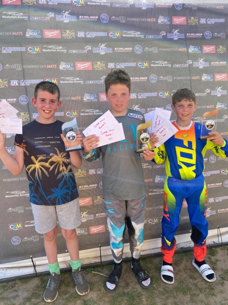 The entry may have been modest but that didn’t reflect the fantastic quality of racing on show from the youths. With ages ranging from 10-14ys, the race times were incredible. The lap times might even have been good enough to win in the Adult C and secure a top10 in the B’s! Rhys Whyment continued his racing recovery after missing the entire season up until last week and he showed he’s on form. It would be Troy Flockhart’s day as he made race 1 look easy with Rhys pushing him. Great show from the small wheel rider as he pushed his big wheel counterpart but Troy’s 8s win showed he kept his cool all race. Malachi Allan got the final podium finishing just ahead of Jaden Anderson. Jaden would improve in race 2 by grabbing the AMD hole-shot and leading the race for a lap before Rhys Whyment would pass and do his utmost to stay in front of Troy Flockhart. It would be Troy’s day though as he shadowed Rhys lap by lap before a small mistake cost him the race and Troy got passed. Rhys had done enough to keep his place as Jaden Anderson managed to stay ahead of Malachi Allan in the final race to beat him on countback and finish third overall. The podium pals were rewarded for their efforts with some prize money courtesy of SS Plant Services as they proudly held up their trophies and their winnings for the proud families.
