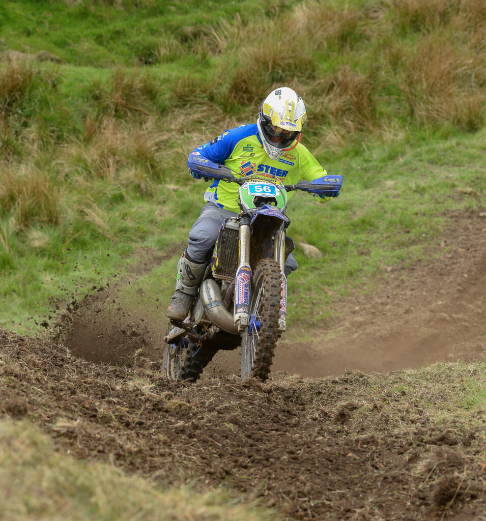 Saturday all riders reported a slick feeling with the dew sat on the fresh grass during the untimed sighting lap. In the first timed test Sam Winterburn found out just how Greasy it was as his did a 360 spin on his Jarvis Husqvarna, costing him valuable time. Beta UK rider Dan Mundell bounced out of the box and fired in a fast opening test fresh from his European events commitments. The lap was made up of fast open grassy hillside behind the paddock, then a plunge down a steep bank into the stream before a fast uphill across to the old Quarry. The exit to the quarry caused riders some issues if they didn’t get a good drive. Clerk of the course Wayne Braybrook said this would be an Enduro Sprint and these aspects ensure the enduro theme was kept firmly in place.