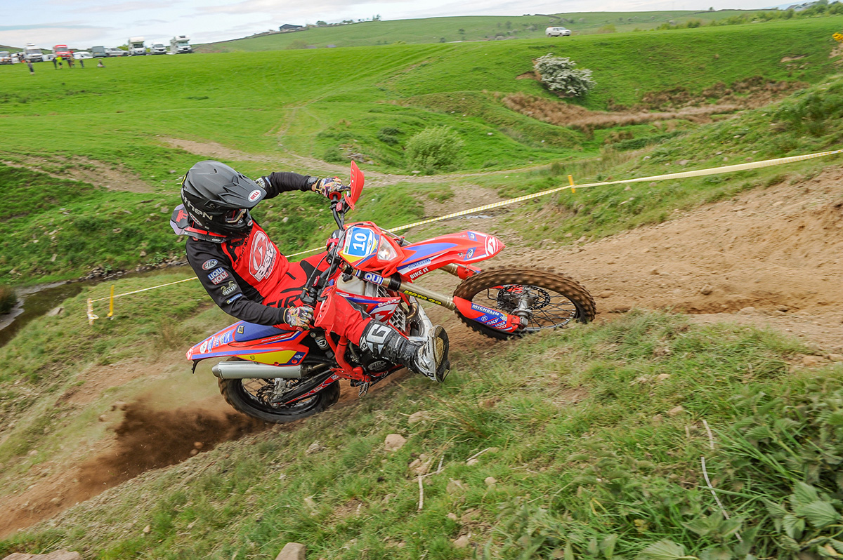 Saturday all riders reported a slick feeling with the dew sat on the fresh grass during the untimed sighting lap. In the first timed test Sam Winterburn found out just how Greasy it was as his did a 360 spin on his Jarvis Husqvarna, costing him valuable time. Beta UK rider Dan Mundell bounced out of the box and fired in a fast opening test fresh from his European events commitments. The lap was made up of fast open grassy hillside behind the paddock, then a plunge down a steep bank into the stream before a fast uphill across to the old Quarry. The exit to the quarry caused riders some issues if they didn’t get a good drive. Clerk of the course Wayne Braybrook said this would be an Enduro Sprint and these aspects ensure the enduro theme was kept firmly in place.
