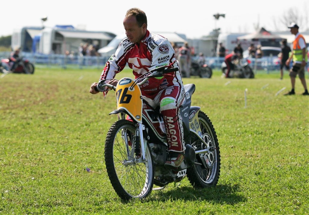 I was just happy to get to the final. I don’t know what happened, but I bolted out of the start, and I was gone. You can’t quite believe it as you are riding and thinking “they are going to start coming by me in a minute”, and no one did. Then on the last lap, Robert Barth or Gerd Riss dived up the inside of me going into the pit corner, and I thought “I am not going to have this, I am going to run round in the dirt at the bottom of the fence”. But because it was so wet and crappy you couldn’t see it, so I have gone up and hit the fence and gone back around the outside, and as I have gone across the finish line to win my chain has come off. I was so lucky to have won that. There was not much of a run from the exit of the fourth turn to the finish line, and as I have got to the finishing line my bikes just gone rrrrring, and I’m like what’s gone on. At that point, I was too busy punching the air. Alan Whale was taking pictures there, and he said he has never seen anyone hit the fence and go up so high and get away with it. It was a stroke of luck.