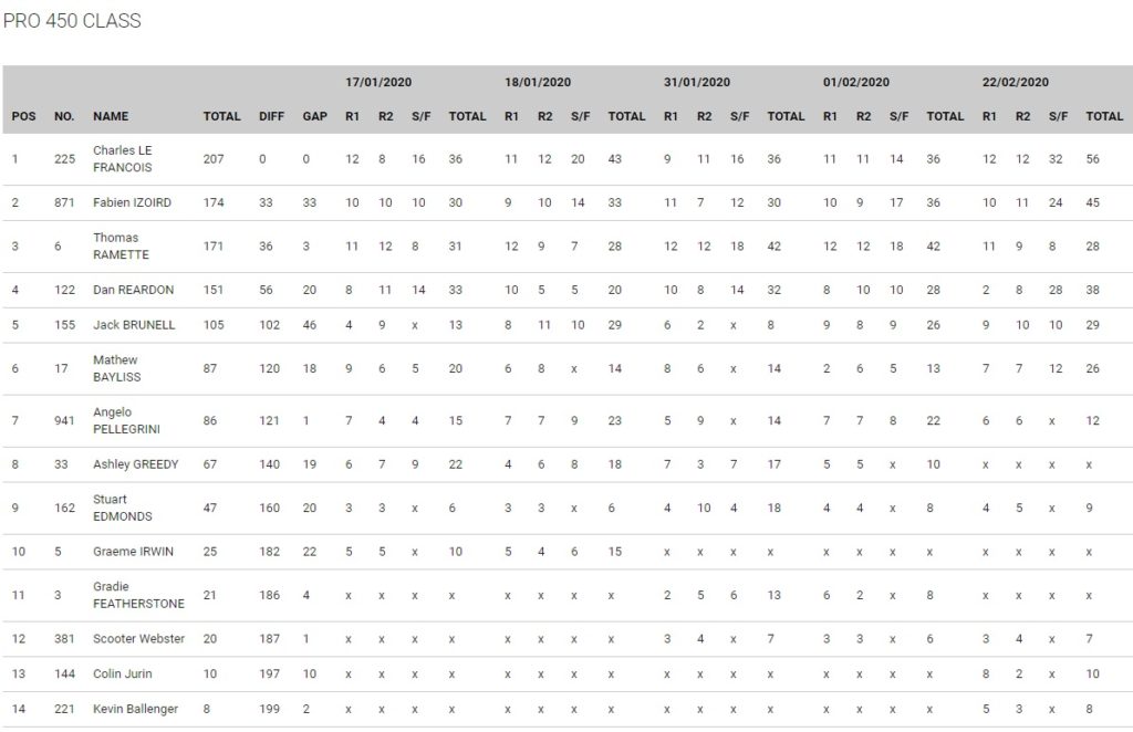 The Pro 450 Championship was won by SR75 World Suzuki rider Charles Lefrancois who has had a dominant Arenacross. Former triple Champion Thomas Ramette (Offset CBD) came in second in the Championship despite a first lap crash in the Superfinal. Shocktech Kawasaki’s Fabien Izoird took a hard earned third.