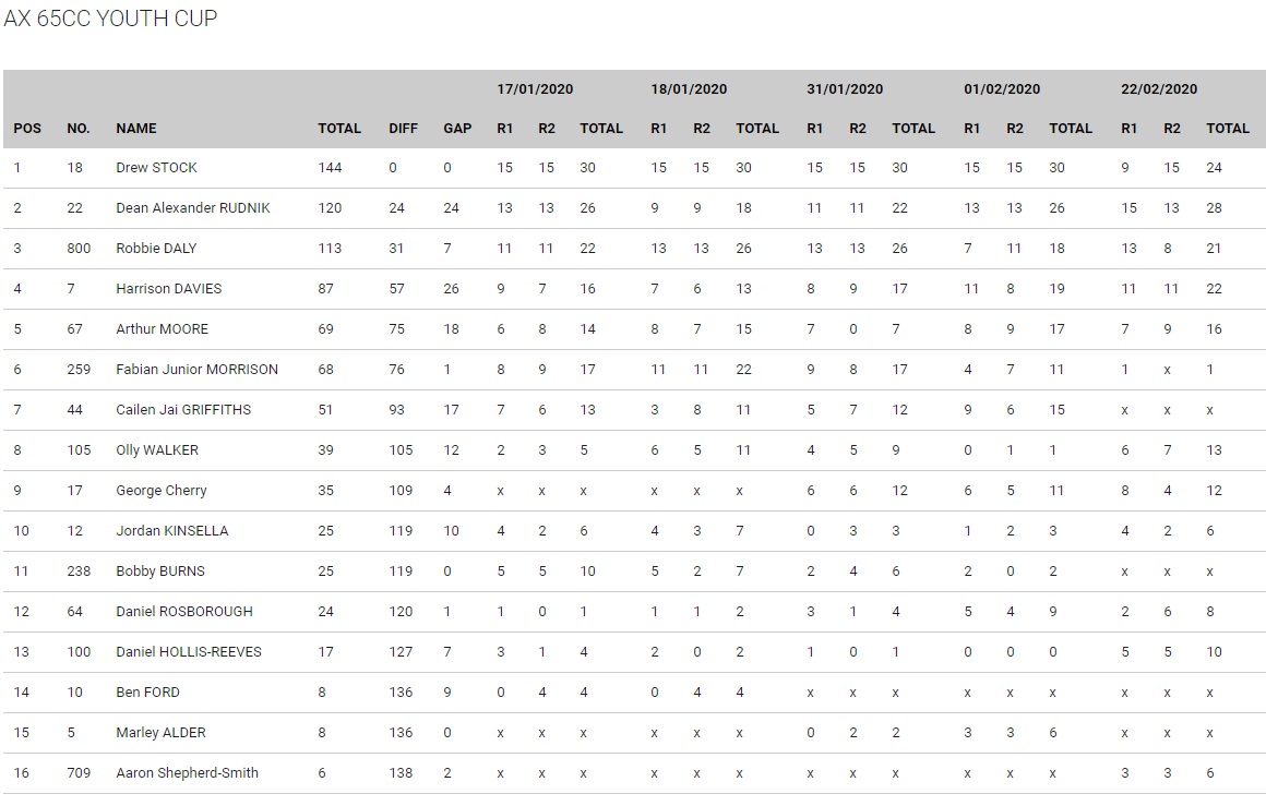 Dean Rudnick would open his Wembley account with a win in the first 65cc race but the soon be crowned champ Drew Stock couldn’t be kept down and he would gain revenge in the second race taking the chequers and the title with it. Rudnik may have won on the night with a 1-2 but he would finish second overall in the final standings with Robbie Daly in third. Daly would open his day with a second before finishing fifth in moto two, while Harrison Davies had his best round of the series with a pair of thirds for third on the night and fourth in the series.
