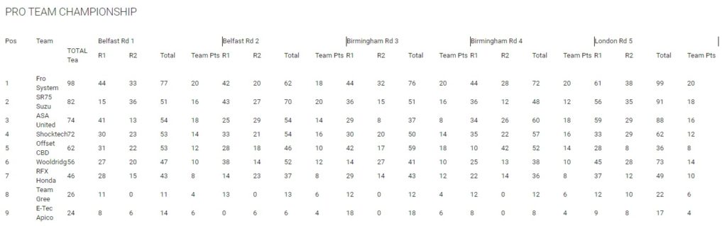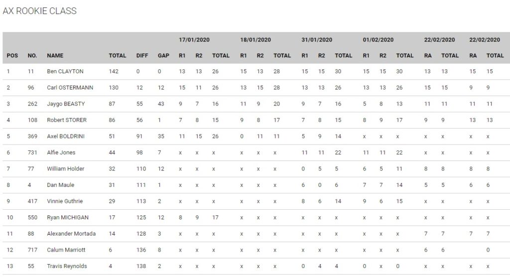 With a win and a second Ben Clayton would take the Rookies title by 12 points over Carl Ostermann, with Jago Beasty taking two thirds to secure the number three spot on the final podium. Ostermann would win the first race but a fourth in the second moto halted his title aspirations. Robert Storer would save his best until last with a great second in the 2nd moto.