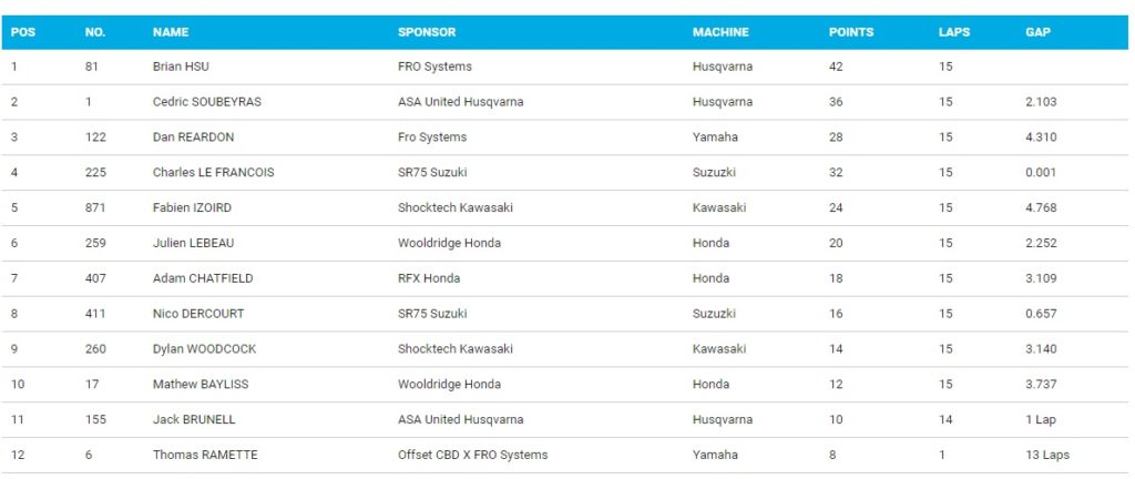 The newcomer Brian HSU (Fro Systems) topped the Pro Lites with ASA United Husqvarna rider Cedric Soubeyras in second and Wooldridge Honda’s Julien Lebeau in third.