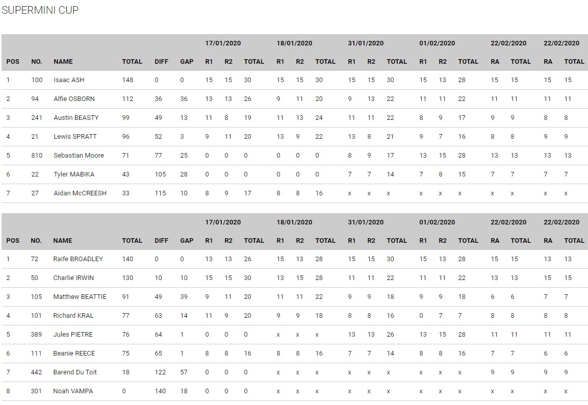 In the Supermini Big Wheels, the battle between Raife Broadley and Charlie Irwin continued to rage as they shared a win and a second apiece with Jules Pietre in third on each occasion. When it came to the overall though Broadley would be the victor 10 points ahead of Irwin with Matthew Beatie in third.