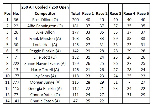 In the 250 class it was Ross Dillon who dominated taking wins in all five races with Alfie Pennington close behind and taking second overall. Luke Dillon was third overall a few points ahead of Frank Marston.