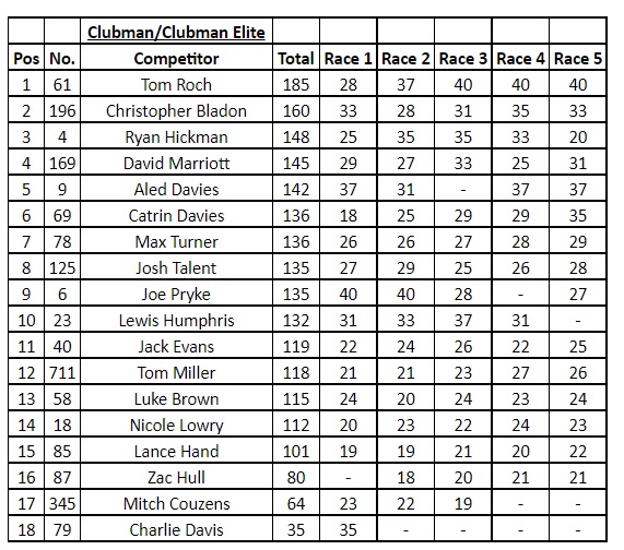 The Clubman Elite and Clubman classes raced together. They also had three races on Saturday and another two on Sunday. Joe Pryke took two wins on day one, but it was Tom Roch who took the overall win with good races finished all weekend and three great wins. Christopher Bladon took second overall.