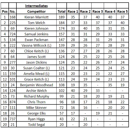 In the intermediates, Archie Welch won the first race, but it was Kieran Marriott who took the overall win with two wins and consistent great races across the weekend. With one win each Tom Welch and Kieren Johnson held the top three places.