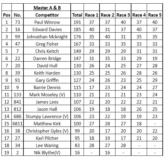 The Masters A and B class, they had three races on Saturday and another two on Sunday. In race one Darren Bridge took the holeshot but Johnathan Mcknight battled past in the first few laps, Paul Winrow battled back from a slow start to take third passing Darren Bridge in the final few laps. Greg Fisher took fourth with Ed Davies recovering from bike problem on the line to blast through for a brilliant fifth place.