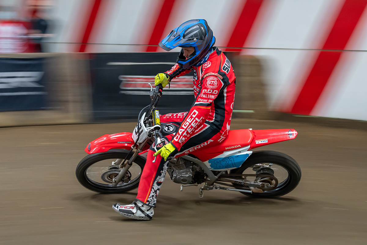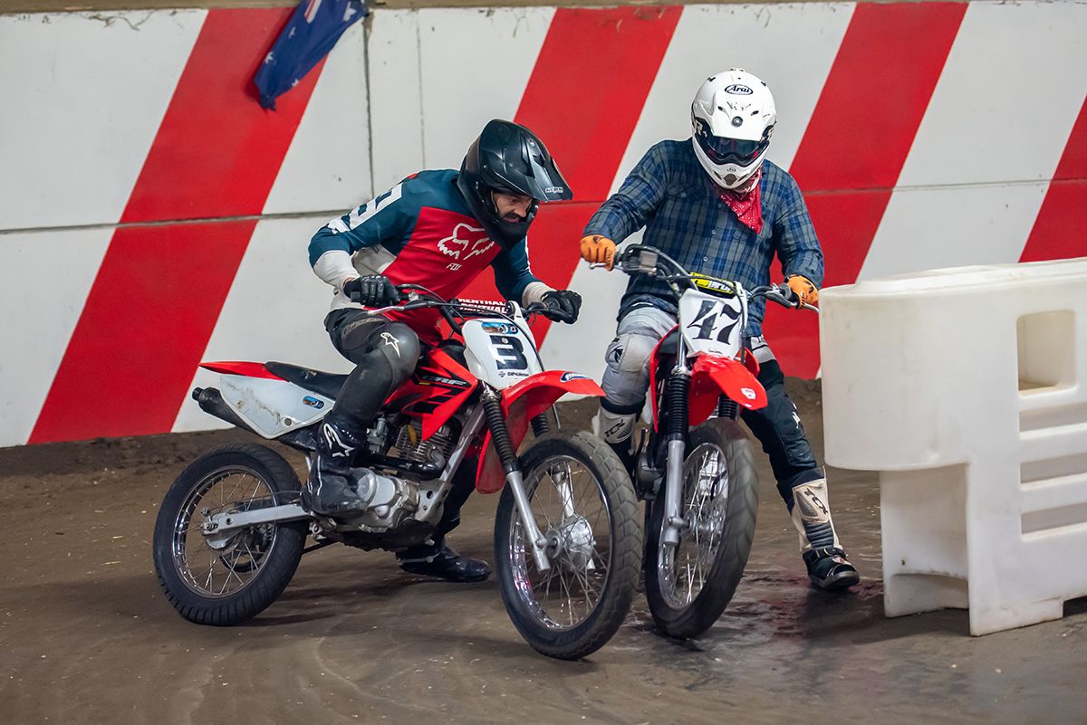 This TT track was on the Champions Flat Track oval but instead of doing a normal oval race Peter Boast, the owner of Champions Flat Track, put some barriers out, so there were two tight left-handers, one big left sweeper and a right turn.