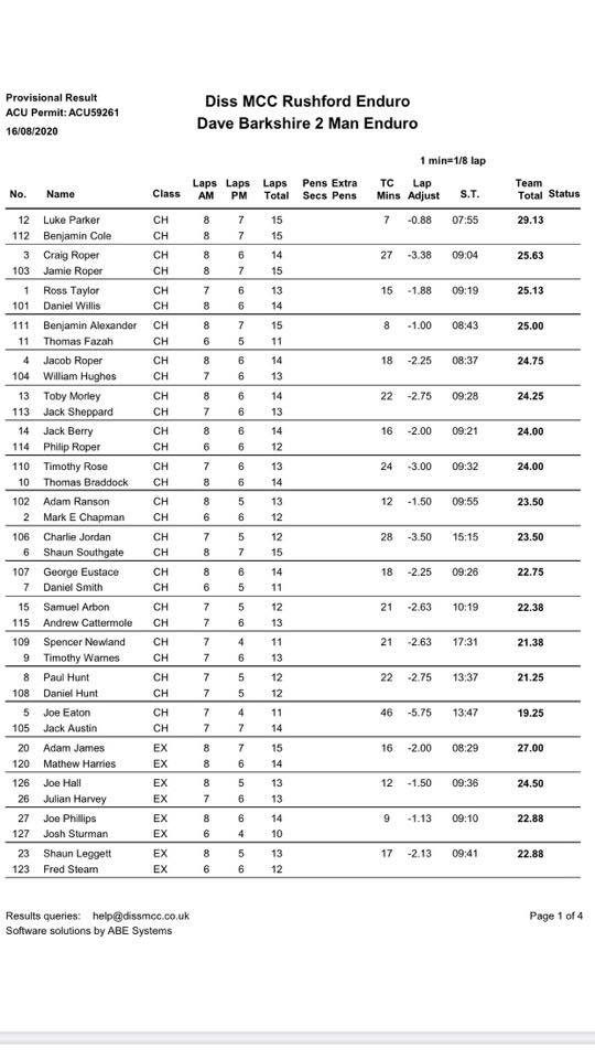 Diss MCC ran the Dave Barkshire 2 man Enduro at Rushford Farm on Sunday. The club express their sincere thanks to the Saker Estates for allowing us to use this fantastic area of land with several woods and stubble fields providing a great and varied 3.6 mile lap.