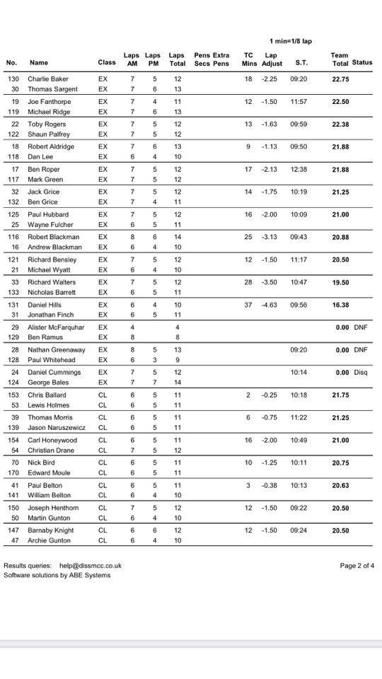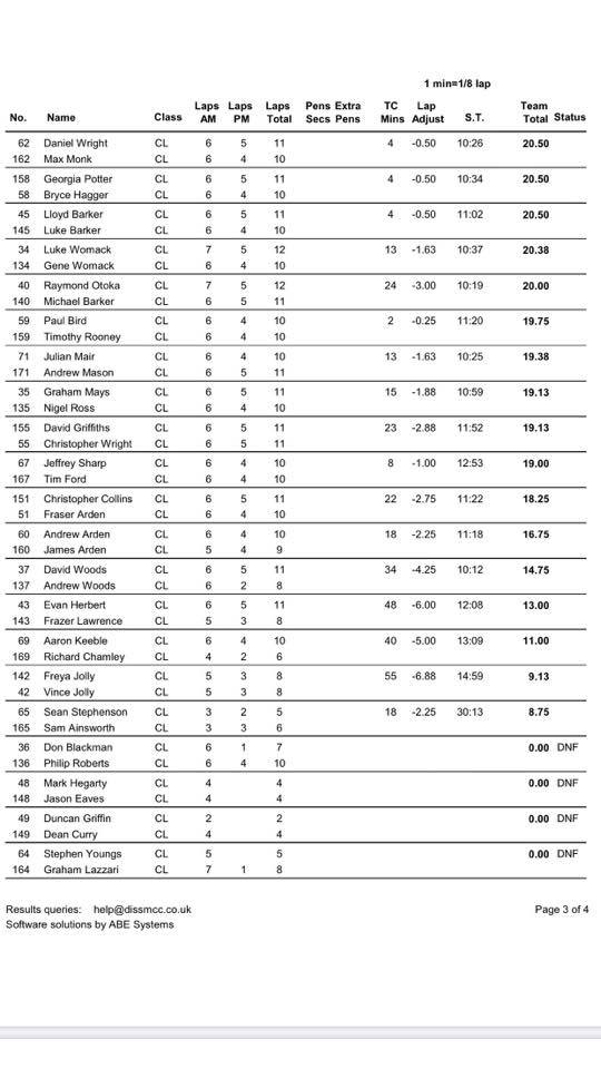 However, Parker and Cole kept flying adding another 14 laps to their score Craig and Jamie Roper and James and Harries the only 2 teams to clock up 13 laps in the much tougher afternoon. The final result saw Parker and Cole 3.5 laps clear of Craig and Jamie Roper