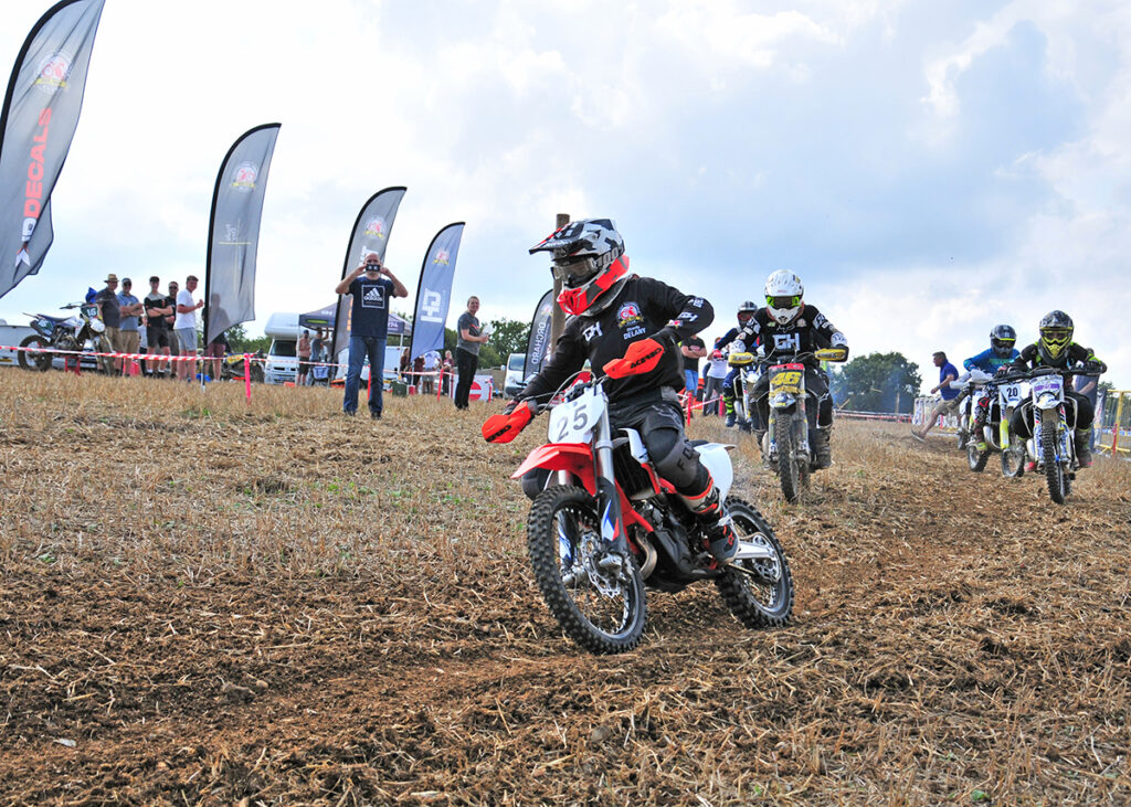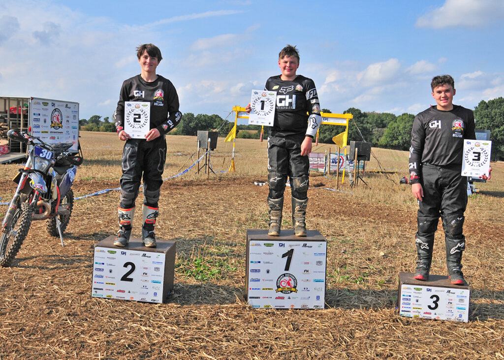 The shortened youth course asked enough questions to keep the youngsters aged 12 to 16 years up on their pegs, changes of terrain, ditches, logs and slippery stubble with long fast straights gave them plenty to concentrate on. Following a le man start where the field ran to their bikes and pulled away, it was Gosfield based Stanly Delany who again had the flying start and took the first corner in the lead over final winner Eddie Belton close on his heels with Rueben Hills, Henry Belton, Louie Curry and Harry Fordham in hot pursuit. Eddie Soon got the lay of the course and took the lead managing to lap Stanly twice before the finish flag, proud to be keeping his unbeaten record in this Hedingham based Eddies first year of youth enduro racing in Sudburys own youth championship series since turning 12 last December.