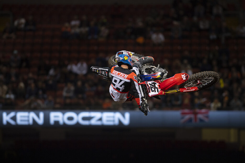 Ken Roczen said on finishing second on the night, “In my superpole lap I wasn’t quite as clean as I wanted to be in the beginning, but the quad was huge and I wasn’t really planning on it but I saw Josh [Hill] do it. What made it really nice though was that it set me up real nice for the turn because I didn’t have to do that single into it with how slippery it was. In that first main event, obviously things happened really quick but from what I could tell there was a tiny line or ledge and the angle I was coming in on, I just wasn’t set up for it. It was so minimal but it just happened so fast. I tried to save it but I couldn’t. It was a bit of a bummer because it felt like it was set up to be a really good race. But it was tough out there and you couldn’t really rely on anything out on track because the berms were really flat. But it made for some great racing tonight.”