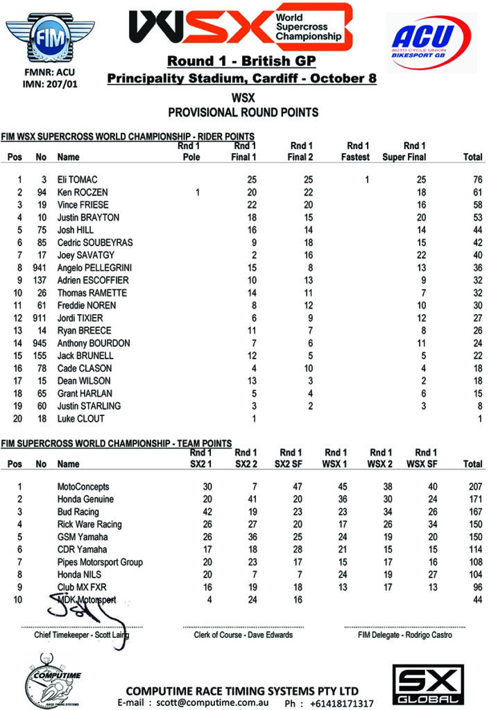 “I need to be smarter than that bone headed move on my part,” Mitchell Oldenburg said on missing out on the win. “I put myself in a bad position on the jump after the guys around me on the start flinched and I fell for it. I came around bad and in the chaos I made a bad move and I’ve got to be smarter than that. But I really enjoyed myself in Cardiff and I had a lot of fun here this weekend. It’s been a blast from the get go and I’m really looking forward to Australia.”