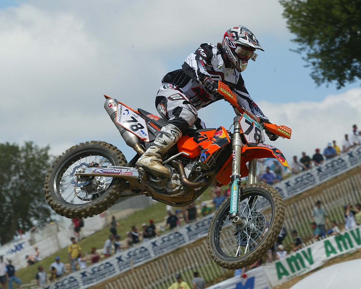 He went back to 250 GPs for 2000, paired with Pit Beirer on the Skittles Yamaha, and won a weird Brazilian GP with 4-2 motos, before a double win at Namur showed some vintage Demaria speed. Still he couldn’t string a championship challenge together, and 2001 was another fruitless campaign and as he turned 30 in January 2002, he looked to be a spent force. However, he found life in the 500cc class with KTM, and became a challenger out of the blue in 2002 when he briefly broke the Everts/Smets domination of the series with a win at Castiglione dal Lago in Italy. That was the one that made him a GP winner on six different brands of motorcycle. He nearly won two in a row but for a last-corner pass from Stefan Everts in Austria that drove KTM team manager Kurt Nicoll to such a rage that he threw rocks at an advert hoarding!