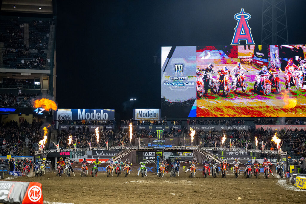 The 2022 Monster Energy AMA Supercross series kicked off Saturday night with Team Honda HRC’s Ken Roczen grabbing his fourth season opener win in the 450SX Class inside a sold-out Angel Stadium. Defending champion Red Bull KTM’s Cooper Webb charged hard for a second place finish amid the screaming of 45,050 race fans. Troy Lee Designs Red Bull GASGAS Factory Racing’s Justin Barcia, who was in line for a record-breaking fourth-straight season opener victory, put in a smart and fast ride to fill out the podium with third. In the Western Regional 250SX Class, Monster Energy Star Racing Yamaha’s Christian Craig turned a good race start into a great start to his season with his first win inside the stadium in which he grew up watching Monster Energy Supercross from the stands.
