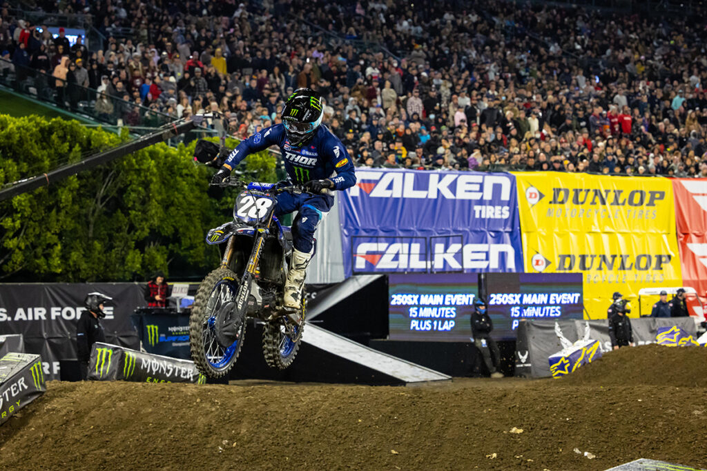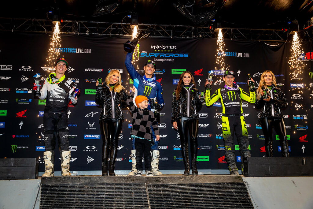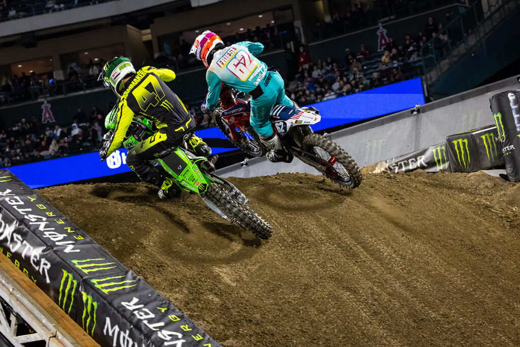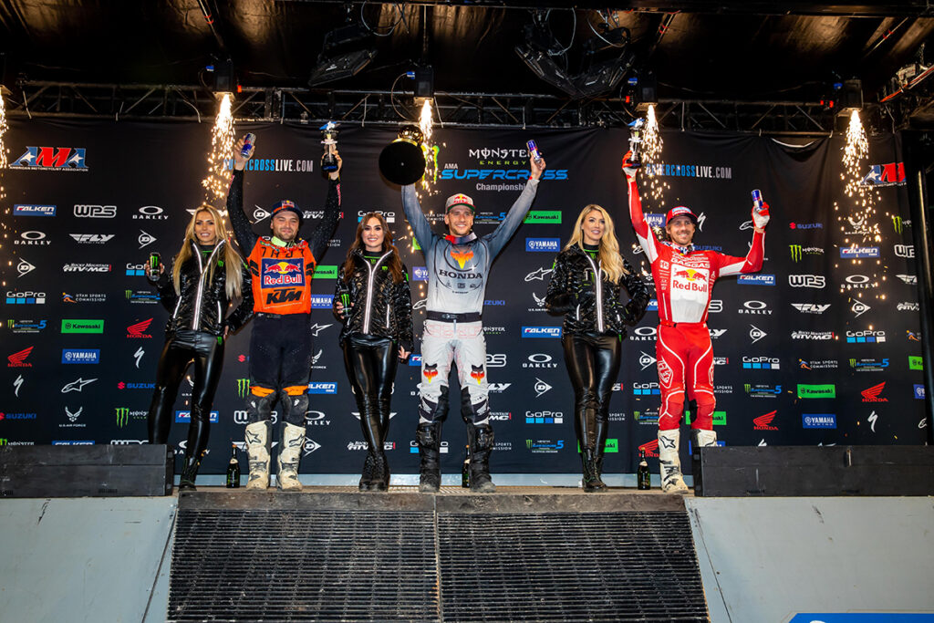 Defending champion Red Bull KTM’s Cooper Webb charged hard for a second place finish amid the screaming of 45,050 race fans. Troy Lee Designs Red Bull GASGAS Factory Racing’s Justin Barcia, who was in line for a record-breaking fourth-straight season opener victory, put in a smart and fast ride to fill out the podium with third. In the Western Regional 250SX Class, Monster Energy Star Racing Yamaha’s Christian Craig turned a good race start into a great start to his season with his first win inside the stadium in which he grew up watching Monster Energy Supercross from the stands.