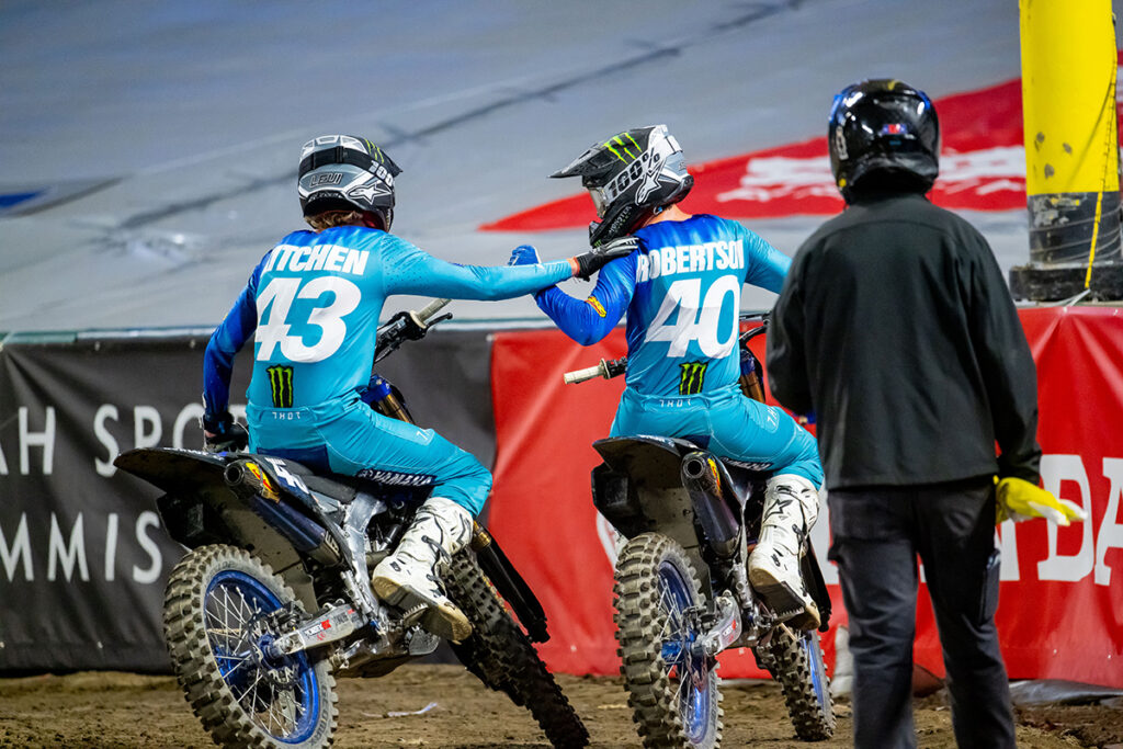 The Western Regional 250SX Class delivered a first-time winner when Monster Energy Yamaha Star Racing’s Levi Kitchen earned the 250SX Class win in only his fifth Supercross race.Chase Sexton grabbed the lead of 450SX Class Main Event 1 ahead of Monster Energy Kawasaki’s Adam Cianciarulo, Ken Roczen, and Monster Energy Yamaha Star Racing’s Dylan Ferrandis. Roczen was quickly into second place. Sexton and Roczen put a comfortable gap on the rest of the field early in the 12-minute plus one lap race. Monster Energy Yamaha Star Racing’s Eli Tomac was in sixth at the start and moving forward. It took him five and a half minutes to reach then pass Cianciarulo; Tomac held the third place spot to the finish. There was an exciting battle around Red Bull KTM’s Cooper Webb through most of the first race. As he and Ferrandis caught and passed Cianciarulo, Jason Anderson reached the pack. On the final lap Anderson contacted Webb in the corner after the whoops. Webb went down and Anderson rode off to capture fifth place. Cianciarulo took sixth ahead of Webb in seventh.
