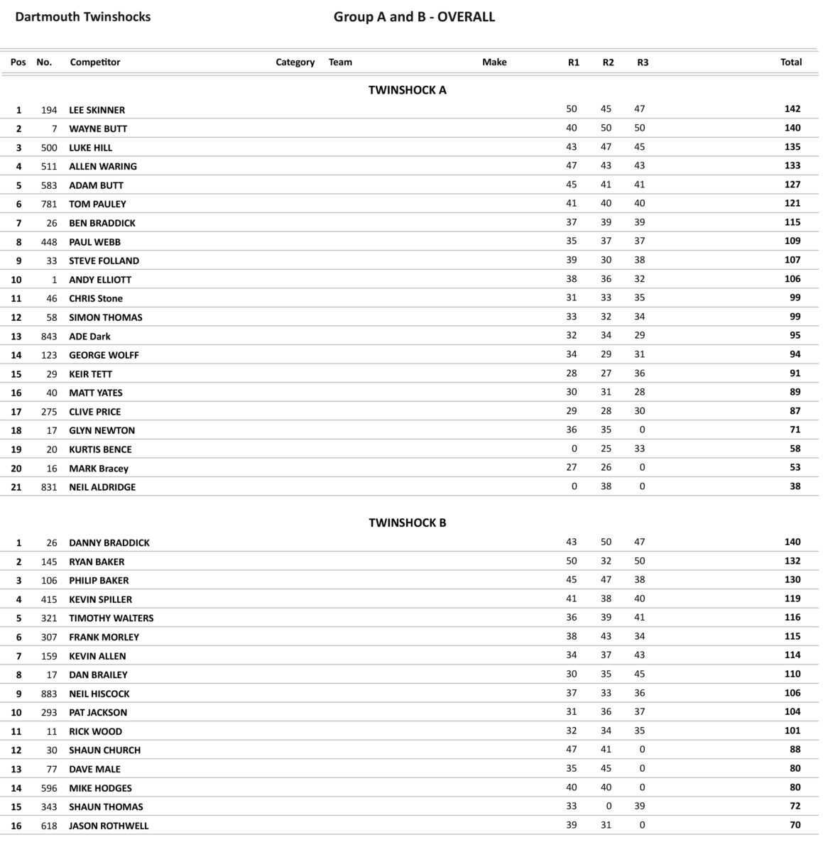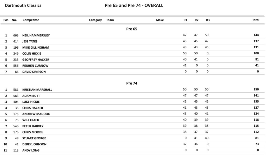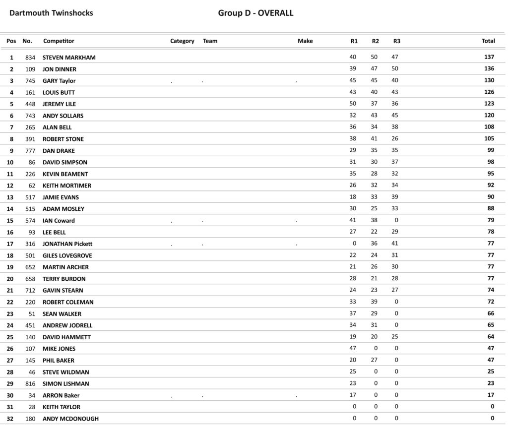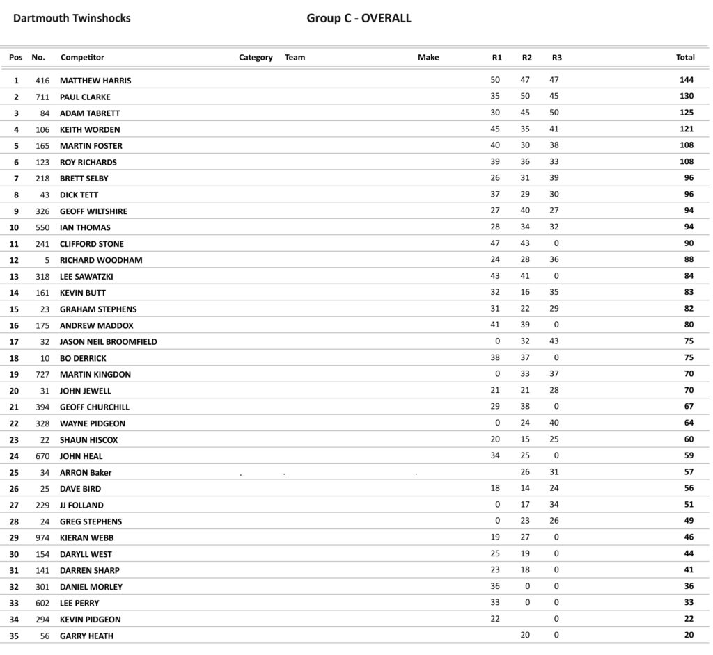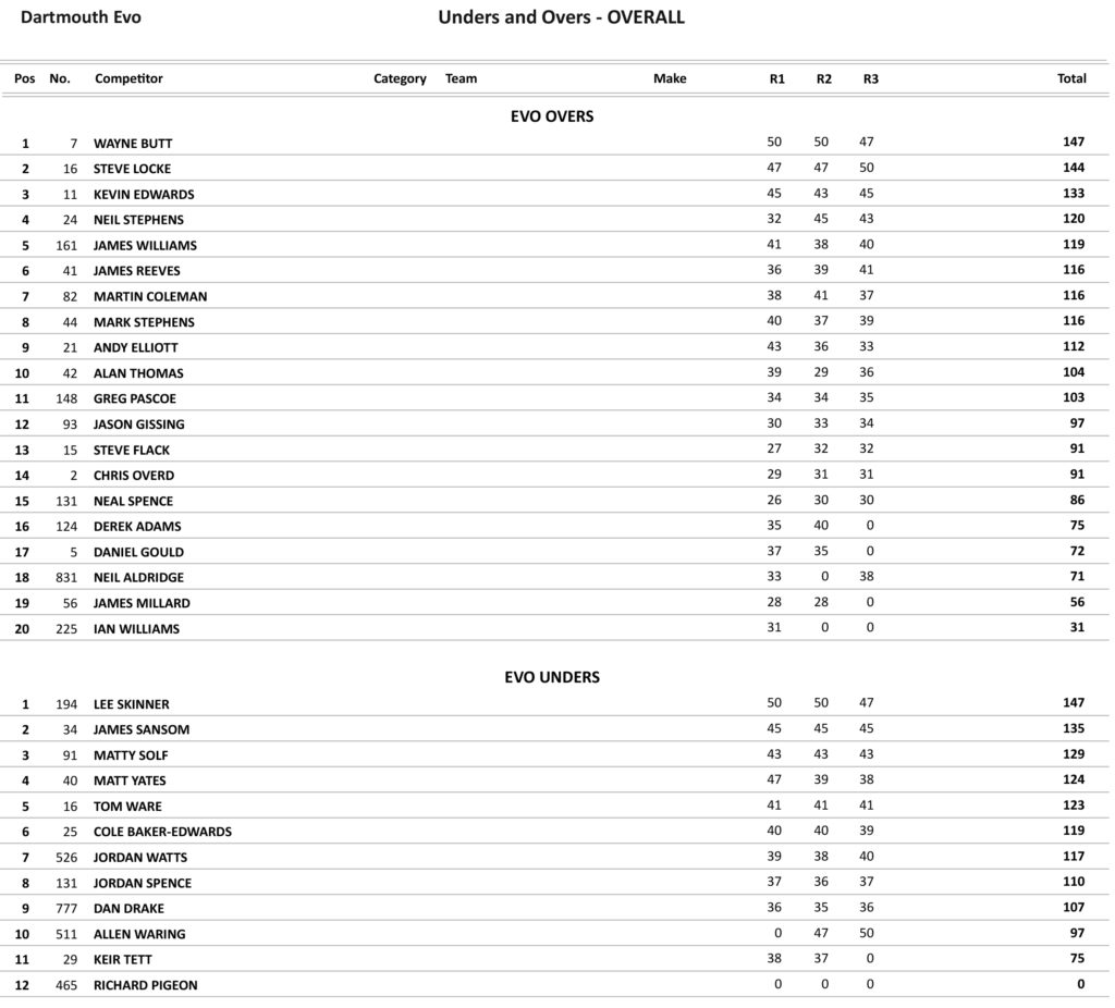 Lee Skinner took the opening win in the Under class from James Sansom and Matty Solf. Butt and Skinner both won their classes in the second race, but in the last Overs race this time it was Locke who took the win from Butt, but Butt took the overall and in the Under 40’s it was a win for Waring from Skinner with Skinner taking the overall.