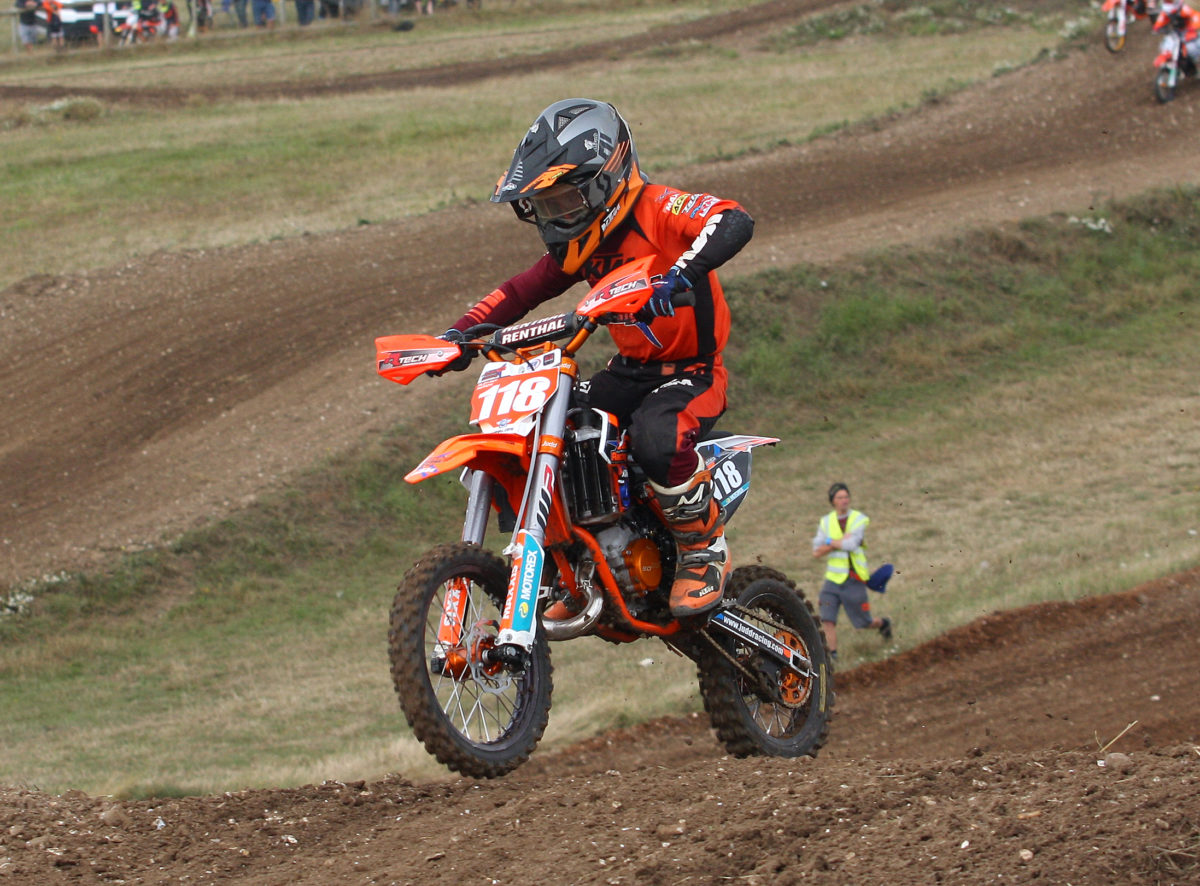 Charlie Richmond in the Fly Racing Small Wheel 85’s was a class act and he was another rider to take all three Moto wins. He could never relax though as Josh Vail was always ready to take advantage of any mistakes Richmond would make and was in close enough contact with the leader to make his presence felt. Vail would be joined on the podium by Reece Jones who fired in two great thirds in the opening two motos. The top three would all receive a set of Fly race kit courtesy of the guys at RaceFX. Thanks to Paul Irwin and the team for their support. Joey Benfield may have been on the fringes of the podium but the lad is quick and he showed that with a great third in the final moto and that helped him clinch fourth overall over Ryan Waggott who would win the Pod Hard Charger award and a set of Pod knee braces courtesy of Madison.co.uk. In fifth place was Gus Mustoe and for never giving up and riding so well was this classes Generate Hustler award winner. Last year’s 65cc champ Freddie Gardiner already looks at home in the Small Wheels and was getting faster as the day went on and would take seventh overall with RITS debutant Harlow Green impressing in eighth. Riley Ingram was another 65cc racer from last year to take the step up and he did it with class, finishing with an impressive ninth overall ahead of Rocco Hands in tenth.