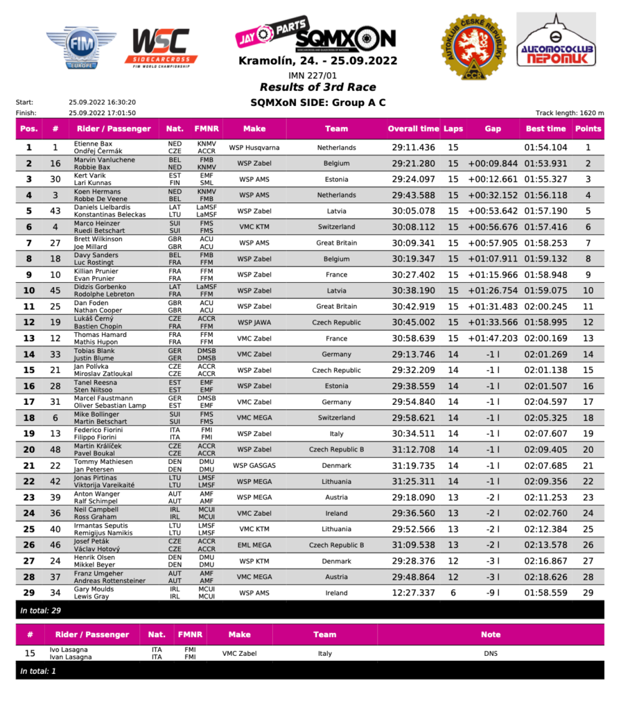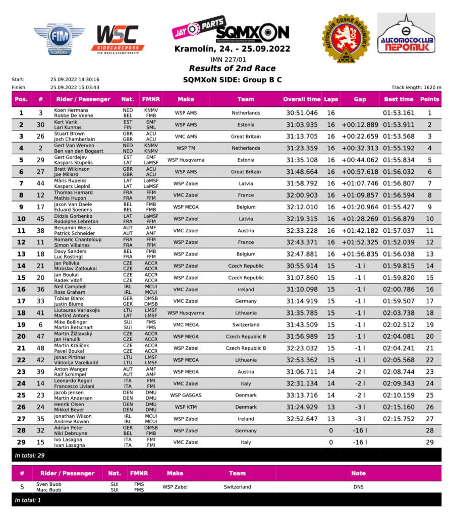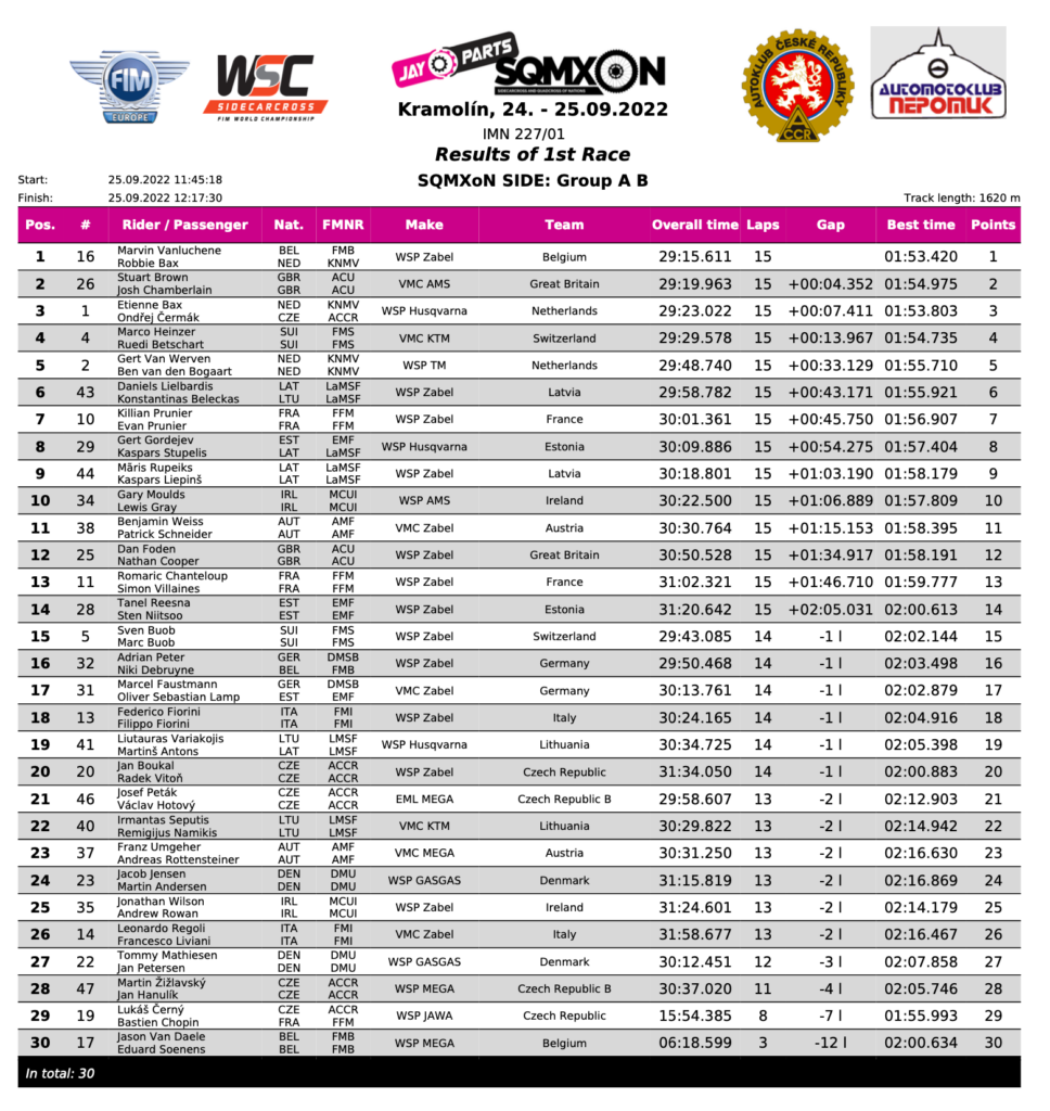 Two rows and the mass start gave us a huge thrill as the pack streamed into the first right-hander, with local rider Lukas Cerny with Bastien Chopin grabbing the lead. Again, just the same as in qualifying, there was a pile-up on the straight, with five teams tangled up. Cerny made the most of his start, but a battling Stuart Brown/Josh Chamberlain fought like terriers on the few early bends to muscle into second place. Brown knew he had to get out front, and they were very impressive all race long. Etienne Bax had a sluggish start, down in sixth pace first time around, with work to do. The Swiss team of Marco Heinzer/Reudi Betschart slotted third for an amazing race, but the Vanluchene/Bax Belgian train was coming. From a second-row start, Marvin was incredible, and picked off first Heinzer, then Brown. It was not easy, but once in front he held a five-second margin over Brown. Etienne Bax/Ondrej Cermak were also making progress through a very fast pack, eventually becoming involved in a race-long fight with Heinzer/Betschart. The Swiss was having none of it, losing out to Bax, only to reclaim the place. This went all the way to the flag with Bax eventually nailing third ahead of Heinzer.