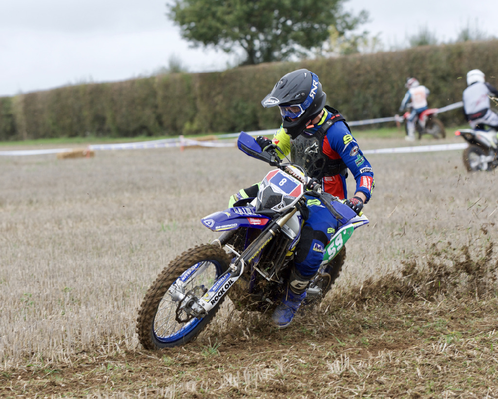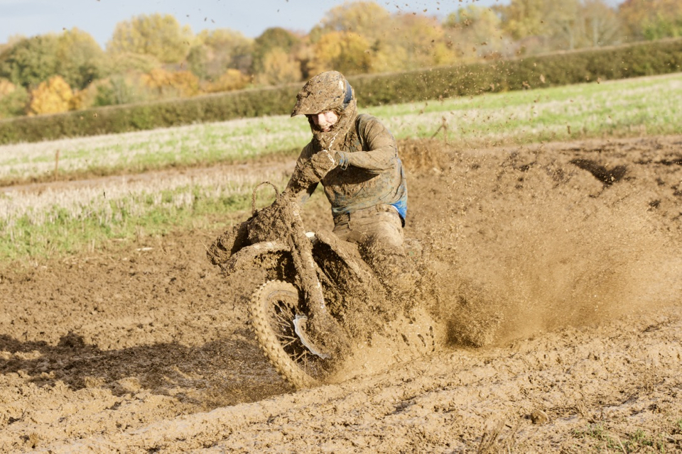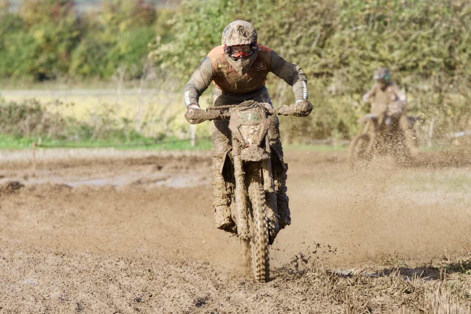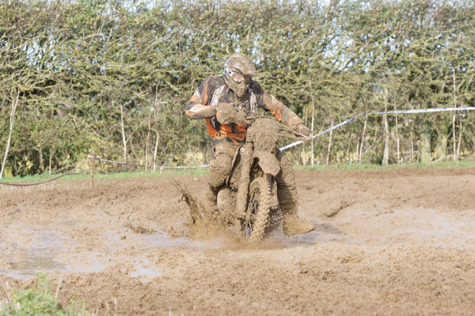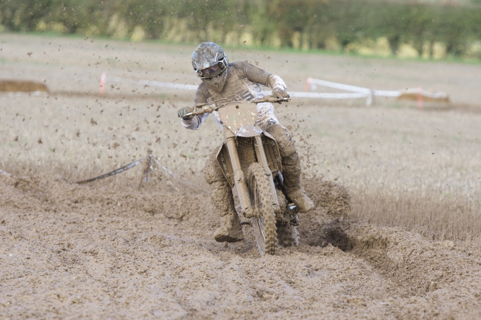 The innovative ‘Motoduro’ was held a week later using the same piece of land with more serious competition. For the ‘Motoduro’ a three mile track was marked out with 200 straw bales, tape and markers and a small woodland section was added. Riders started from the Cusses Gorse MX start gate with holeshot prizes for two of the four 30 minute ‘Motos’ for each class. The event attracted full grids and a strong field to battle in the mud, rain, wind, and bright sunshine, a typical Autumn day!