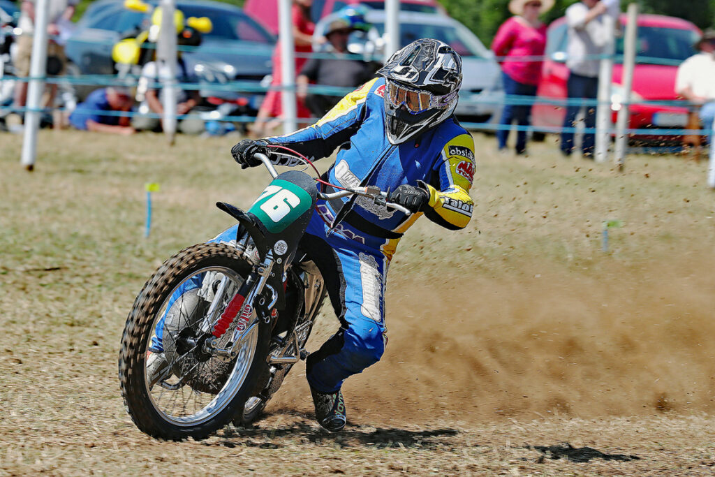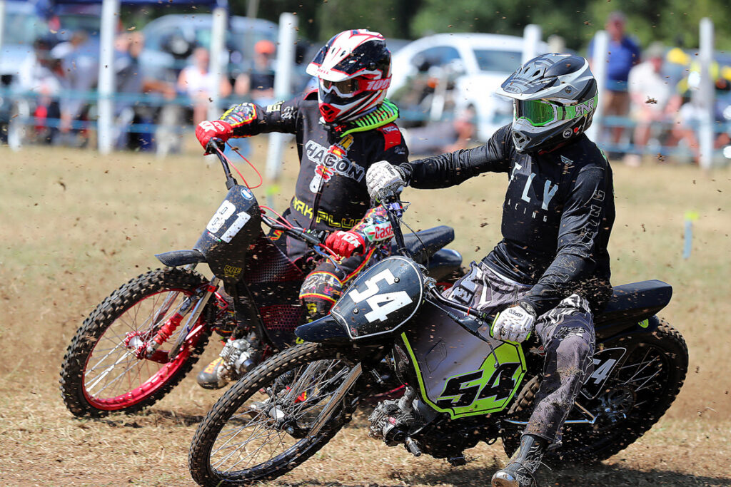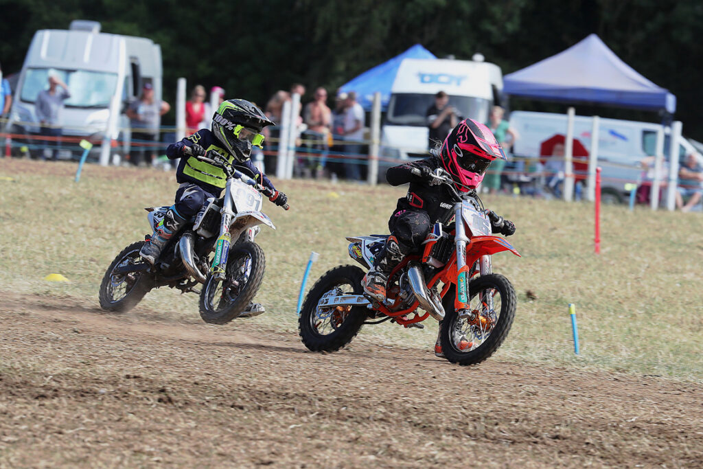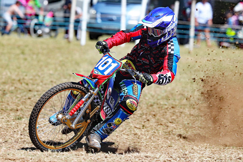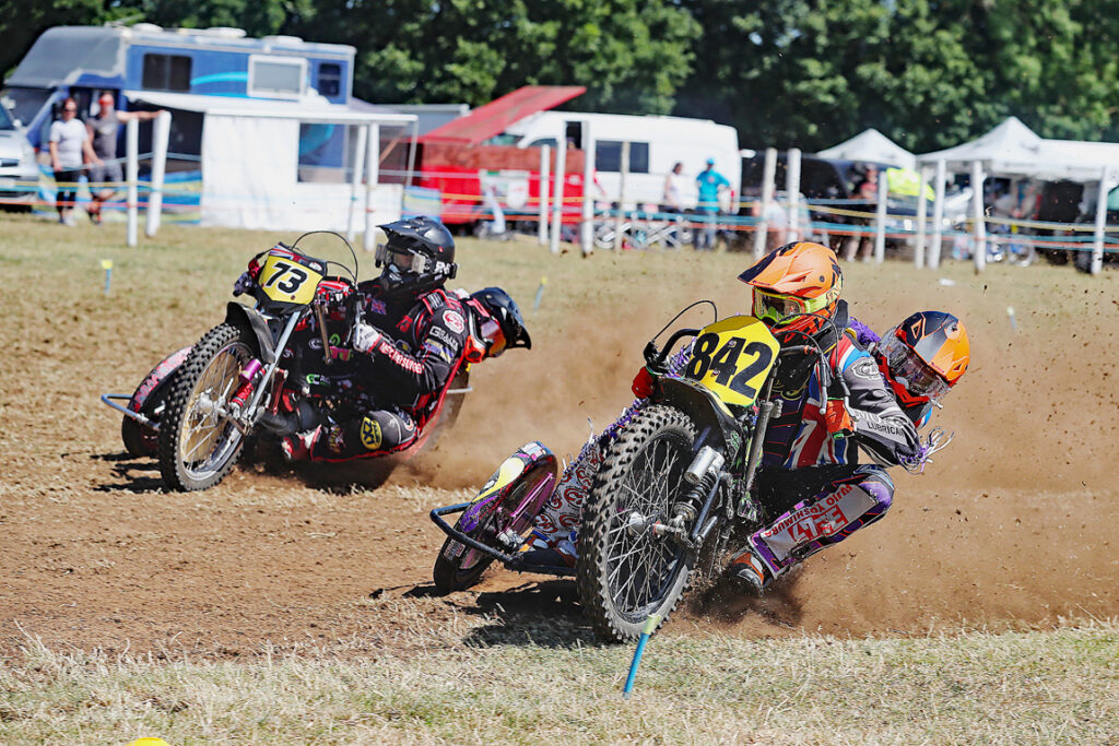 First though there was a serious issue to overcome as the recent scorching heat meant that ground conditions were parched and horrendously dry, thus meaning that stopping the threat of dust would be just about an impossible task regardless of any equipment available!. Doing their very best though to minimise the problem, the Grasstrack Banter team watered the Whaddon Farm circuit both before and during the action in an attempt to give the riders the best vision possible and help to complete the event. And despite that constant dust menace, a full programme was managed producing some great action as the spotlight fell on the Youth riders who took centre stage to compete in Junior Bantasia.