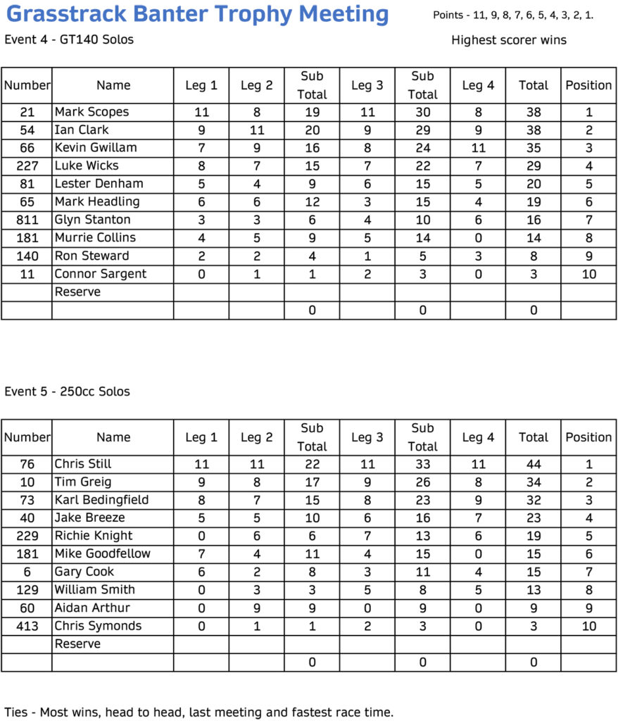 Two riders who would normally also come to the tapes in the 250cc battles are Cameron Taylor and Luke Harris but on Sunday they instead appeared in the 350cc class. Showing their quality they were to earn the top two overall places as Steve Garside got home in 3rd. Earlier, Taylor after being defeated by Harris in the opener then reeled off a hat-trick of wins. There was though a slightly anxious moment in the last one for young Taylor when he touched the tapes and clerk of the course Adrian Croft ordered a restart and warning to the Gloucestershire ace!