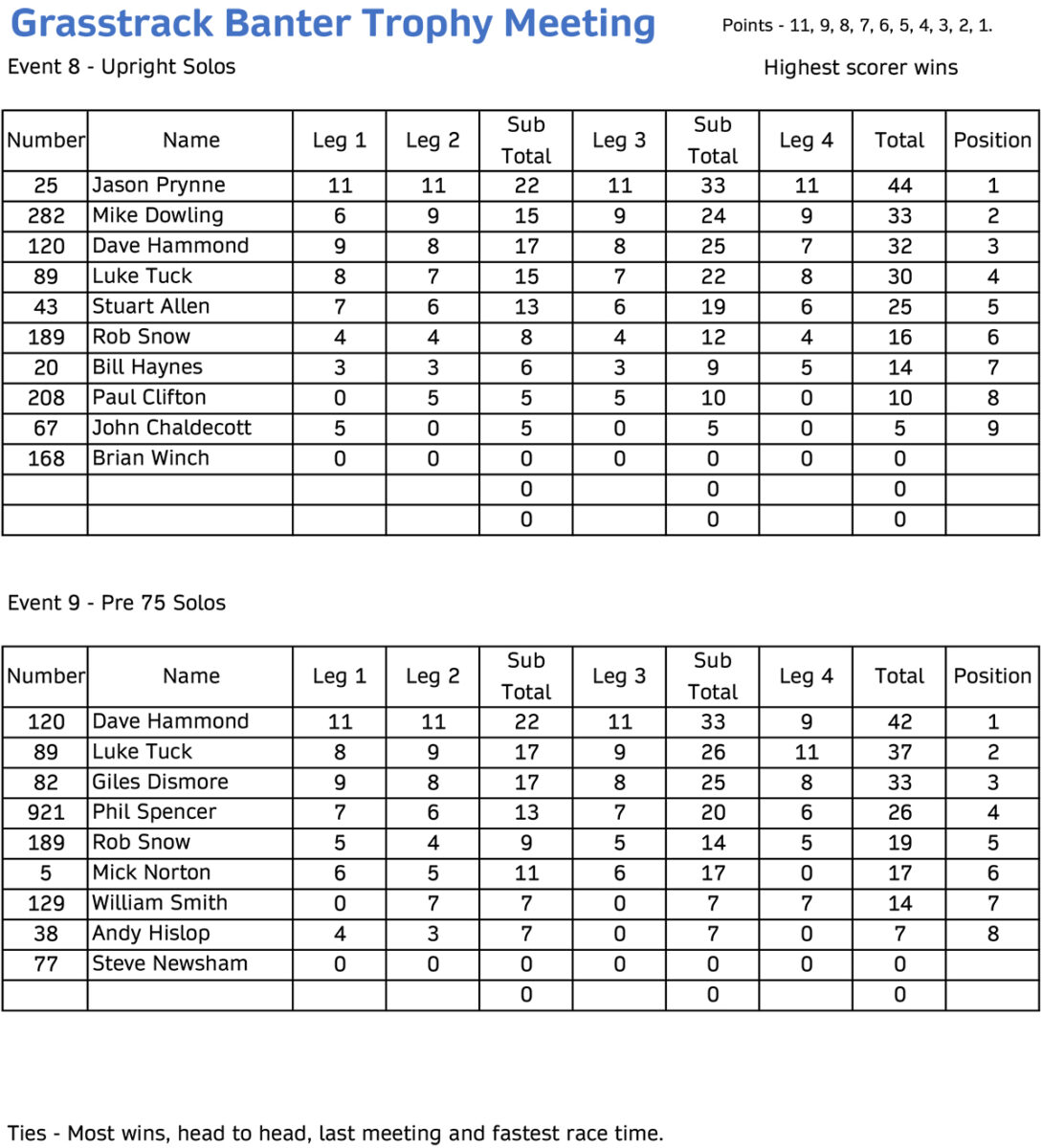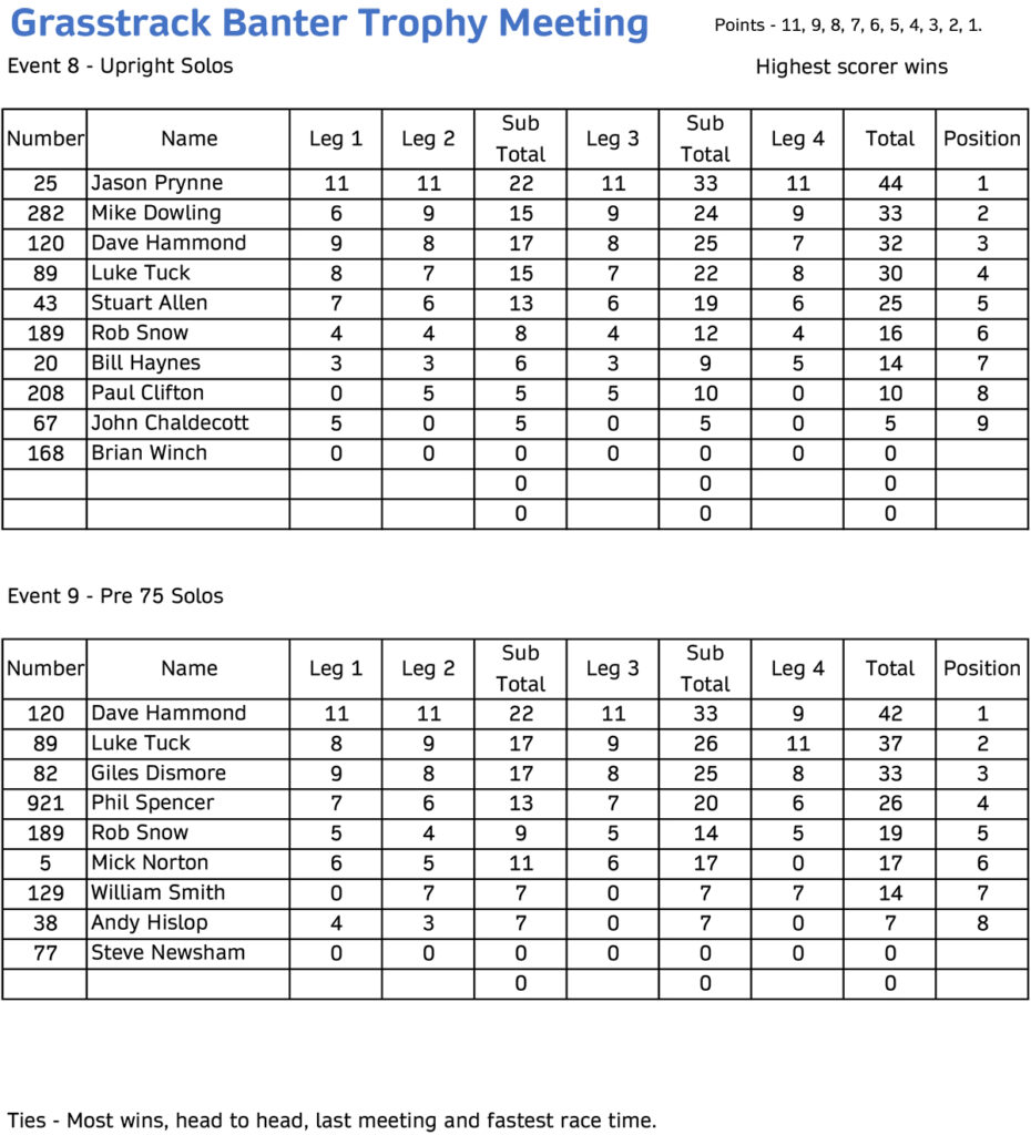 Completing the solo action was racing for the Upright and Pre-75 classes. In the Uprights, Cornish rider Jason Prynne cruised to victory winning all four heats. With Prynne immaculate and in total control, just 3 points separated the riders in contention for the remaining podium spots. Eventually taking 2nd was Mike Dowling with Dave Hammond 3rd. Gloucestershire based Hammond was also in action in the Pre-75 and in that contest, he won 3 out of 4 heats to earn the overall victory as Luke Tuck and Giles Dismore completed the podium.