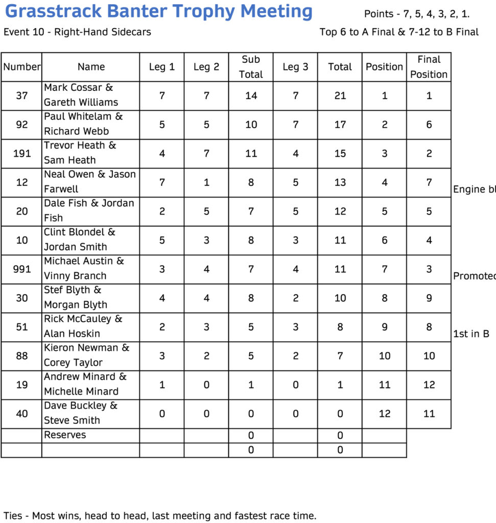 Taking the win was Cossar following a fantastic scrap with Heath. In a rip-roaring contest, Heath even managed a stunning inside pass to get infront before Cossar came storming back for the win. After finishing 2nd in the qualifying scores, the final did not go to plan for Whitelam, spinning off and finishing in last place. In the 1000cc ‘B’ Final, Rick McCauley/Alan Hoskin was also involved in a classic, fighting off Stef Blyth/Morgan Blyth as Kieron Newman/Corey Taylor took 3rd.