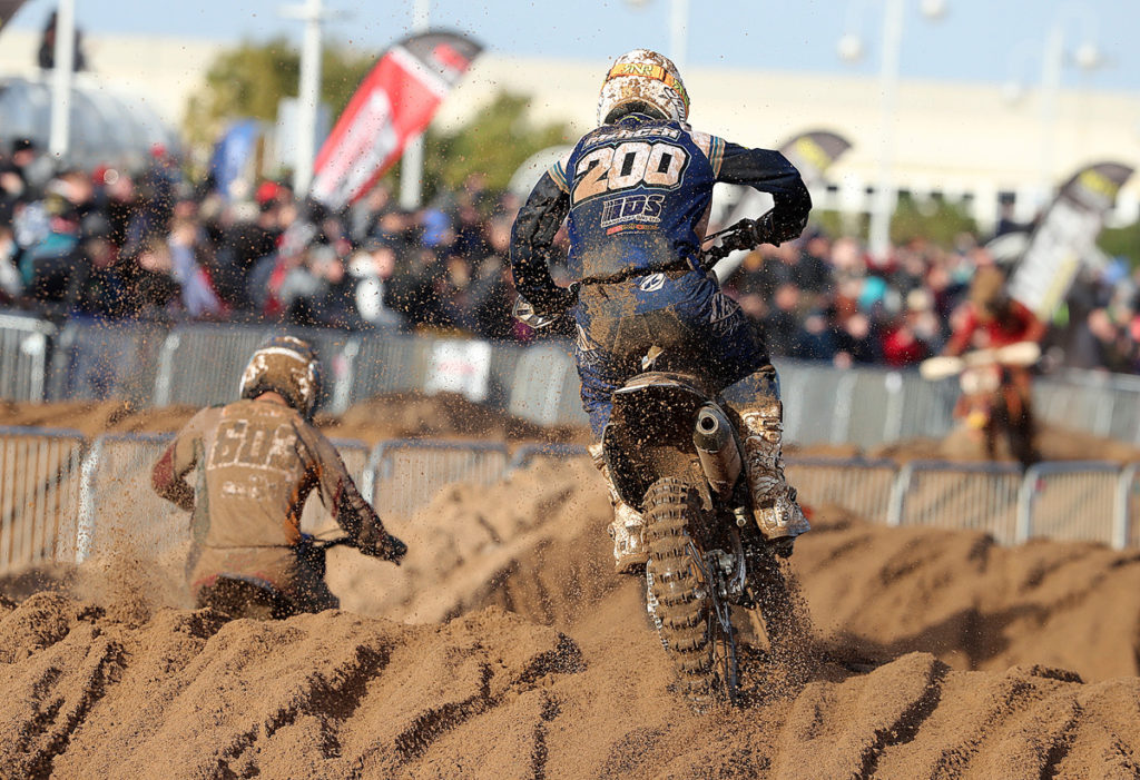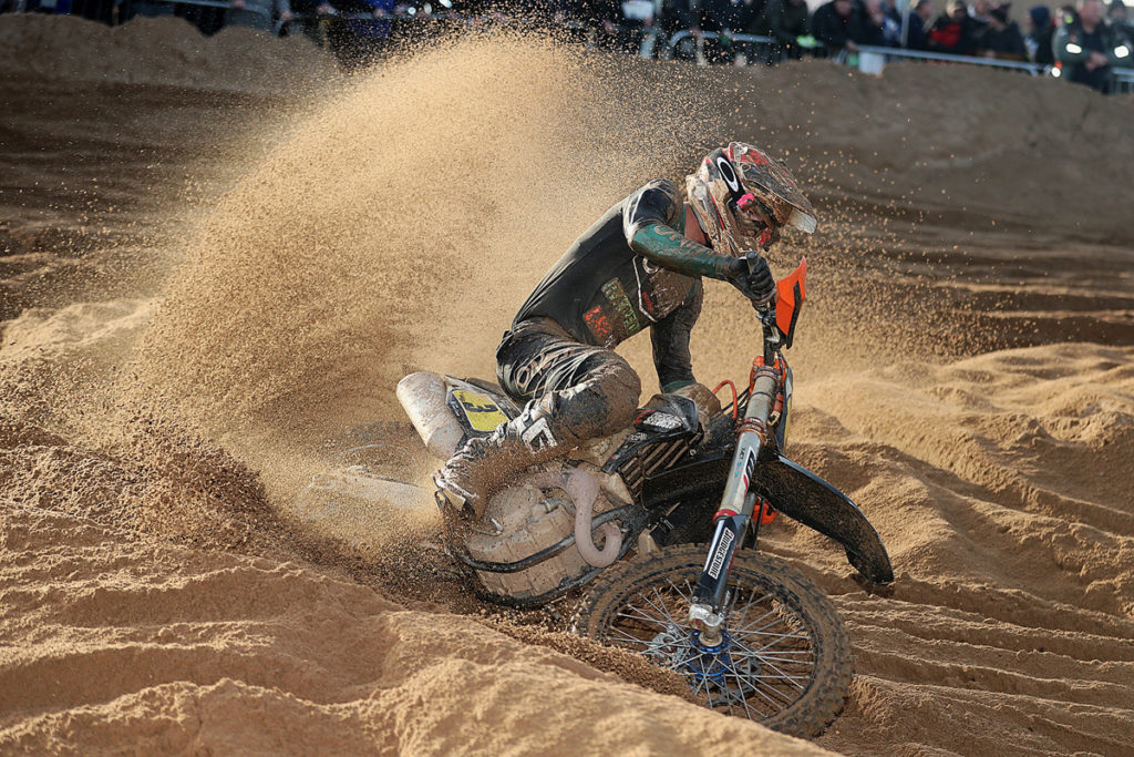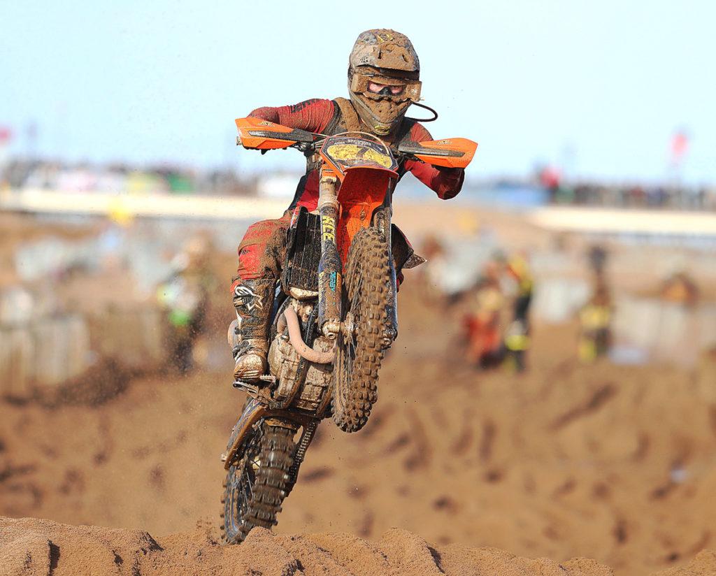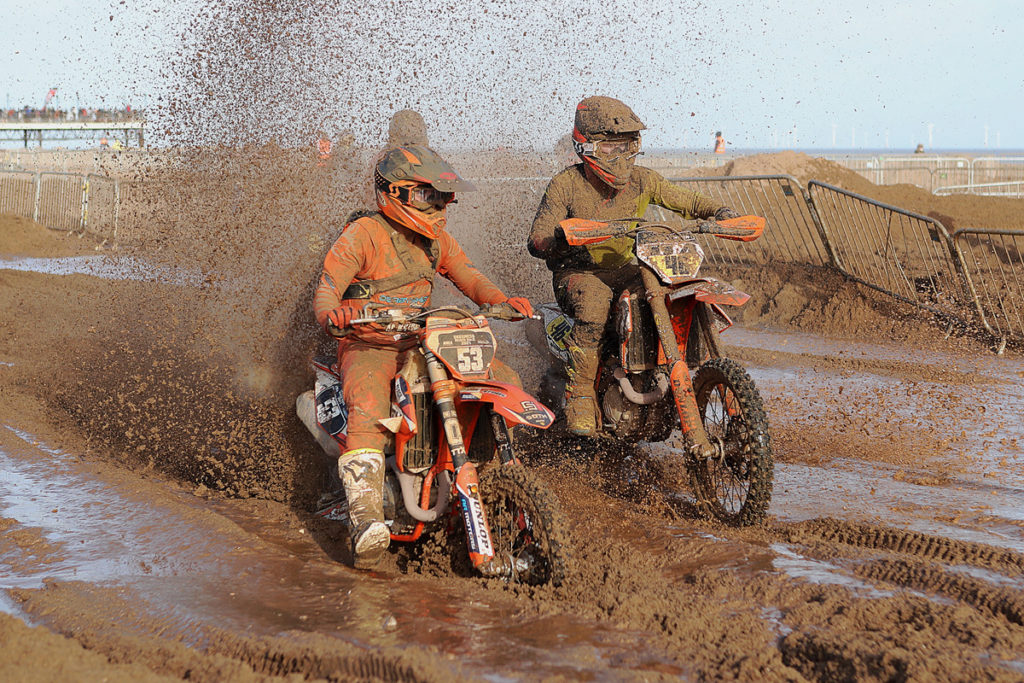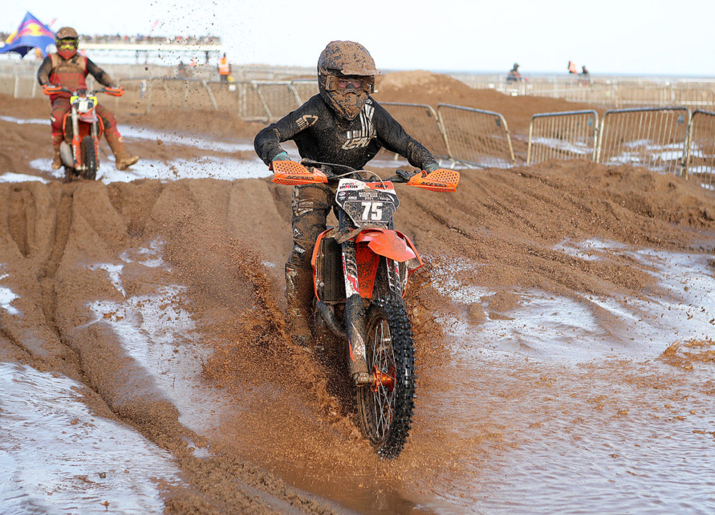 Undeterred though, track curator Phil Roberts and his crew along with the AMCA Events team rolled up their sleeves, manned the machines and got to work repairing the damage. Digging trenches and gulley’s the water was eventually routed back to the sea but the going was now naturally extremely heavy in some patches. Most importantly though the race had been saved although the intended start time had been pushed back and the duration of the contest cut to 2.5 hours.