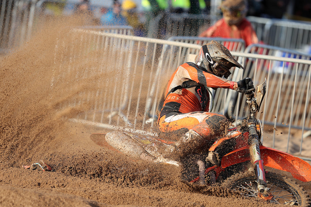 As usual though the first race of the weekend was the Clubman Sprint contest which was of a 1.5 hour duration. And with the circuit having been constructed by Phil Roberts and not featuring a big opening sand dune to confront the riders, it meant that they could immediately engage full race mode right from the off. As the gates were opened and the pack roared towards turn, one there was to be immediate drama though as Brad Thornhill crashed spectacularly. Thankfully the pack managed to avoid Brad and he was quickly on his feet and starting to chase the pack.