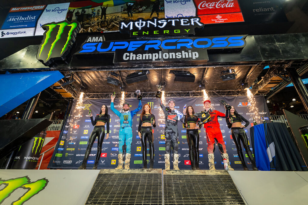Monster Energy Yamaha Star Racing’s Eli Tomac returned to his winning ways, holding firm through a dramatic Round 5 of the 2023 Monster Energy AMA Supercross. Team Honda HRC’s Chase Sexton had the lead in his sights but had to settle for second inside NRG Stadium in Houston, Texas.