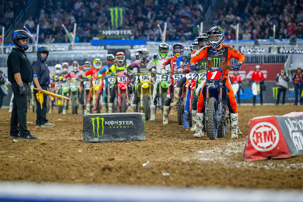 When the gate dropped for the 450SX Class Main Event, defending champion Eli Tomac jumped out into the lead with Red Bull KTM’s Aaron Plessinger pressuring him from the start. But 3:25 into the 20-minute plus one lap race, a crashed rider necessitated a red flag and a temporary stop to the action. The rules called for a unique staggered re-start. The racers were lined up, one after the other according to their race order, then thrown back into battle with the wave of a green flag. The starting position order was Tomac, Plessinger, Anderson, Sexton, and Red Bull KTM’s Cooper Webb, but once back underway Anderson quickly took over second place. Sexton was around Plessinger shortly after and with 13:05 remaining on the race clock Sexton got into the second-place spot.