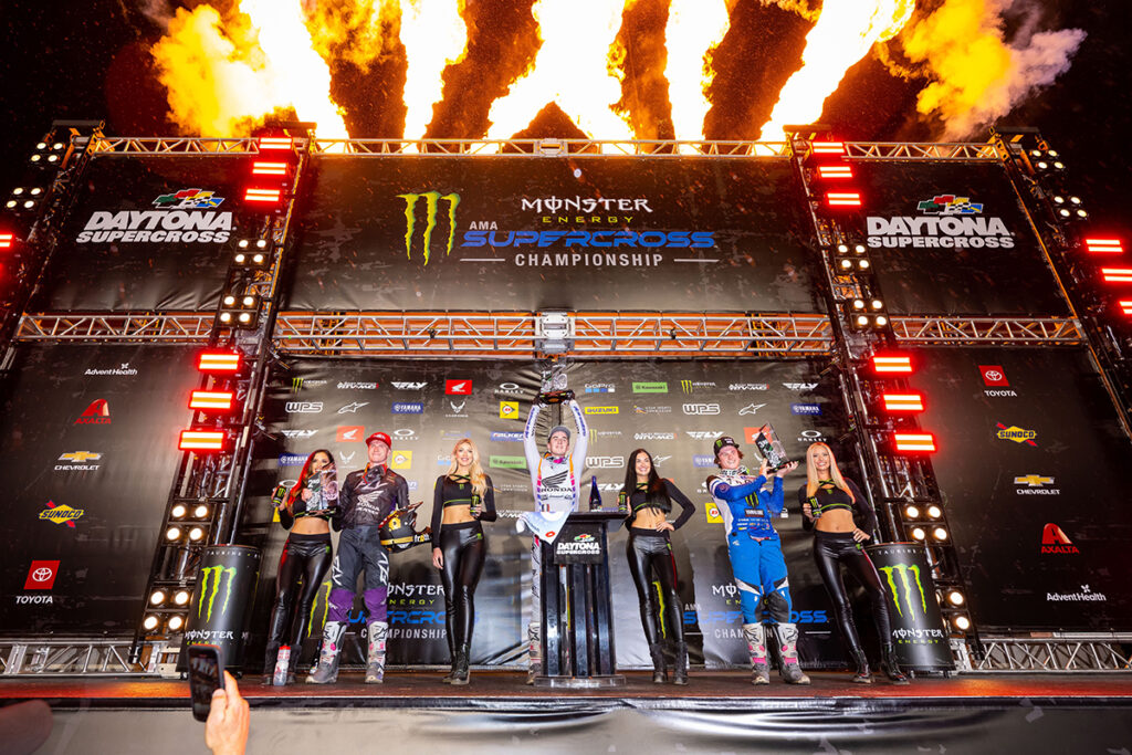 The win by Lawrence matched his brother’s victory in 2022, making the Lawrence brothers the first in the sport’s history to each have a Daytona Supercross win. This augments their other ‘first’ this season as being the only brother duo to simultaneously lead both the Eastern and the Western Regional 250SX Class points. Anstie earned his second runner-up finish of 2023 and rookie Haiden Deegan earned his career-first podium finish in only his fourth professional Supercross race.