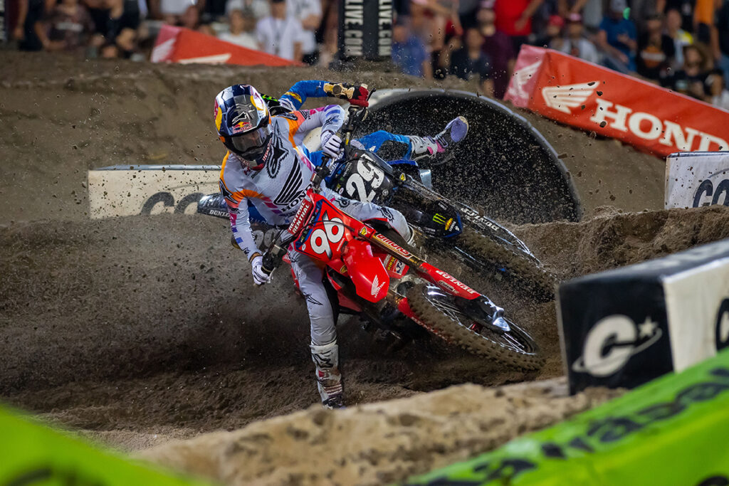 Red Bull KTM’s Cooper Webb was close but had to settle for second place at Round 8 on the unique track built into the trioval of the Daytona International Speedway. Team Honda HRC’s Chase Sexton had some close calls but no crashes to finish third on the high-speed Supercross track. In the fourth round of the 10-round Eastern Regional 250SX Class series, Team Honda HRC’s Hunter Lawrence took the Daytona win in convincing style.