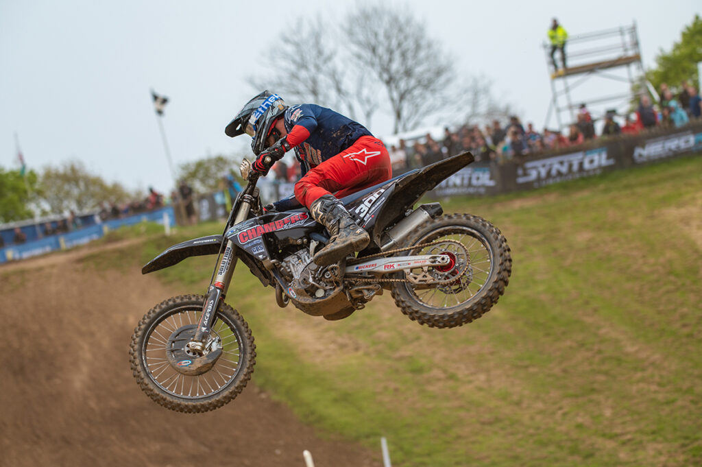 Tom Grimshaw – It has been a mega weekend at Landrake for the second round of the MX Nationals going 1 -2 for my first ever Pro overall win. I am absolutely stoked sat here but both races were challenging as the track was slippery due to the rain and hard to make passes. I managed to put myself into good positions off the start and took my first race win in the opening moto and then in second race it was a 4-way battle and I managed to keep my nerve and bring it home for second and the overall win. I am now leading the championship and my confidence is high as we head to the British next weekend.
