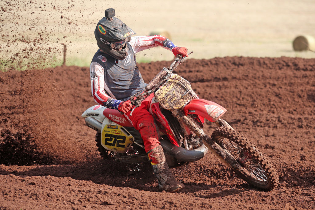 Burton took victory again in moto two, moving up from 4th and passing the hard charging leading trio consisting of another AMCA debutant Luke Hawkins, Neville Bradshaw, racing his big Red CR500 Honda in its final event and Tommy Alba. With Burton taking control on lap five, early pace-setter Hawkins went down to 6th as Bradshaw got home in 2nd despite very close attention from Alba whilst Mackrel struggling with a reoccurring shoulder injury was 4th. On this occasion, Burton’s closest title rivals Greedy and Waterman had to settle for 5th and 7th places respectively.